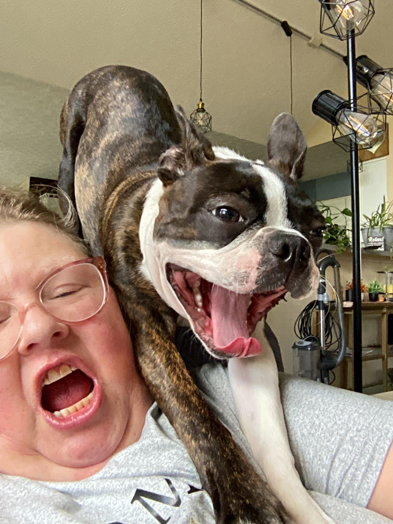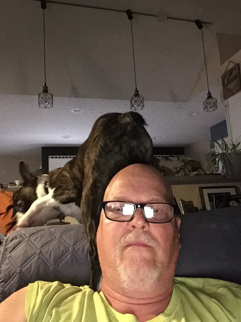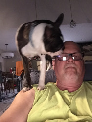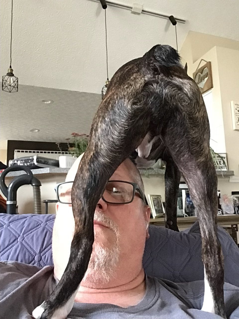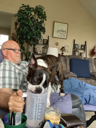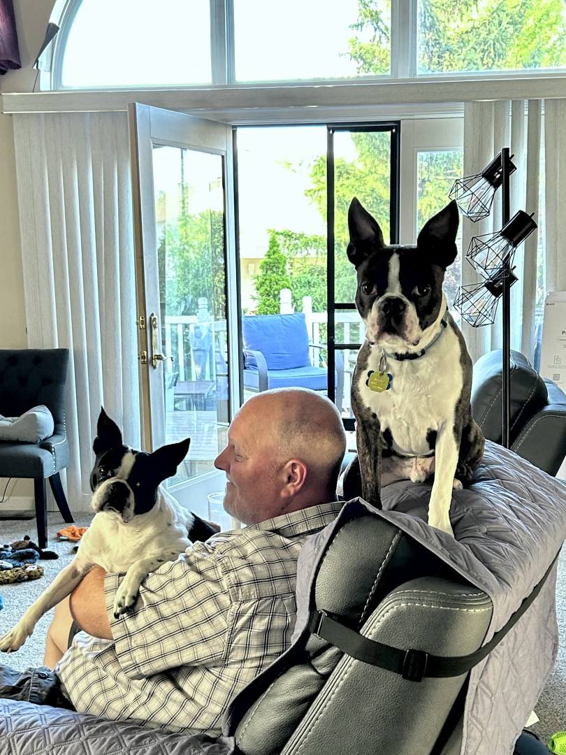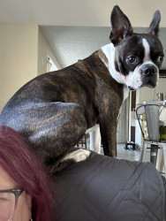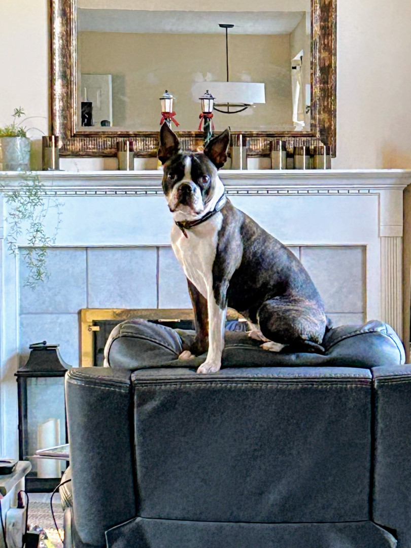 For being a larger Boston Terrier his athleticism & strength blows peoples minds. I’d love to get him into agility courses. He likes to sits on your shoulder or head and lays on the top of a recliner like a cat. Also he can jump to catch something thrown to him and uses his front paws like hands to catch it.