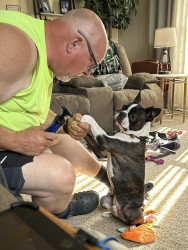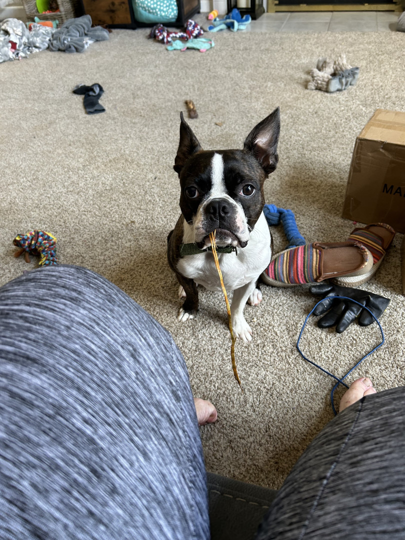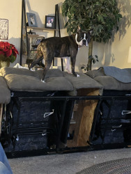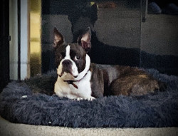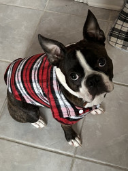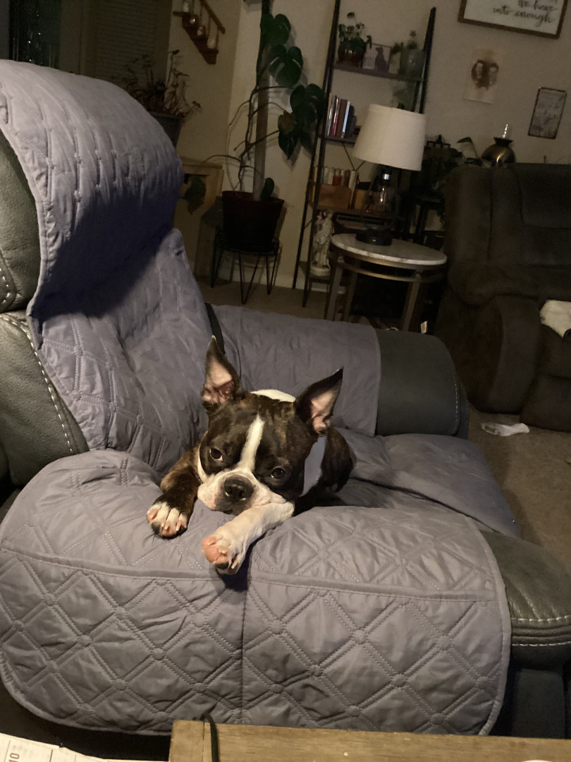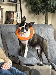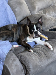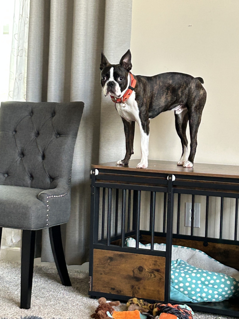 Ozzy is a 14 month old hansom brindle Boston Terrier. He is so smart, athletic, and defiant he makes everything a game that he usually wind.