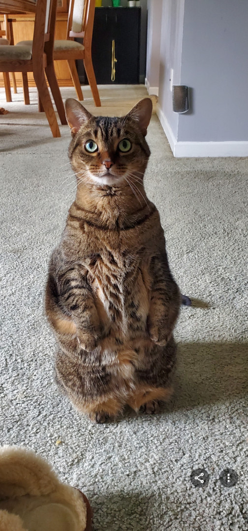 AB's most unique quality is standing up on her back legs like in the picture thar we sent in! I have not seen too many cats sit like that! She also likes to lay flat on her back with her legs apart!