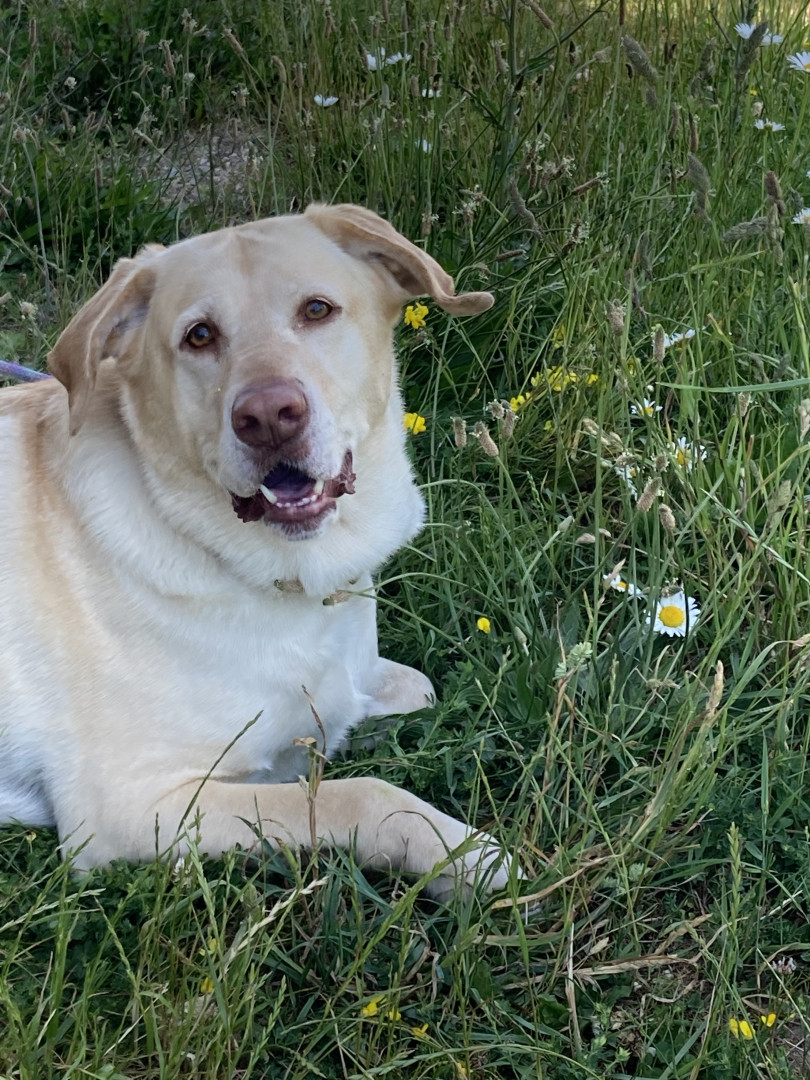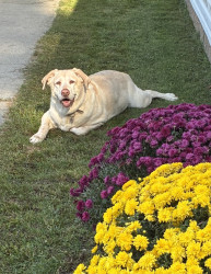 When Abby was a baby and I had to mow with a push mower. I was afraid she’d wander off so I’d hook her leash to the back loop of my pants and she would follow me. She is now 13 and still does the same thing with no leash every time I mow.