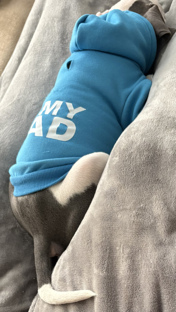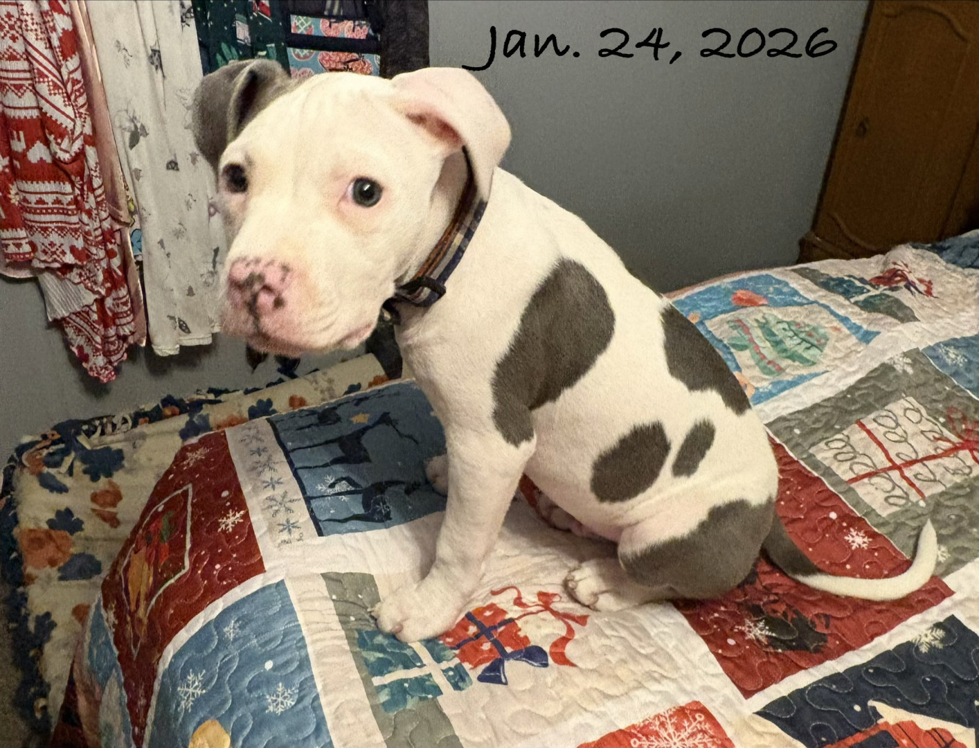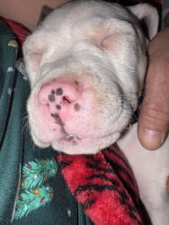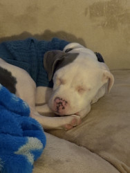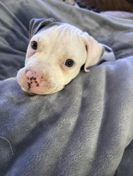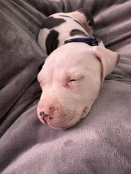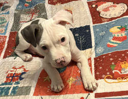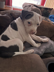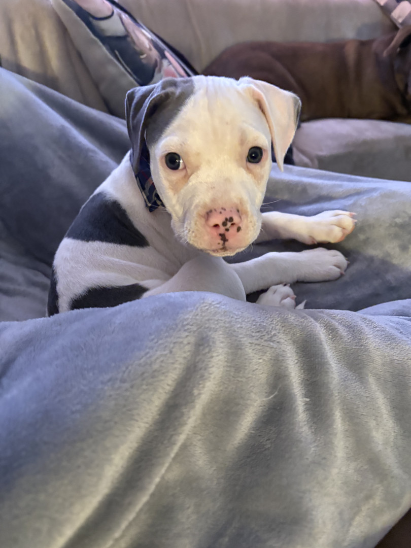 Abraham or Abe is only 9 weeks old. He’s an American Pitbull & just a huge sweetie pie! We’re hoping his eyes stay blue!