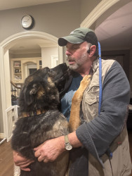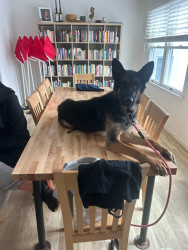 Alastair has the sweetest way of saying hello- he gives hugs. He pops up on his hind legs, gently rests his front paws on your hips, and gives the biggest squeeze, like it’s the only greeting he’s ever known. We’re still polishing his manners, of course, but this loving habit is part of his charm. His hugs are pure heart and they never fail to make you smile.