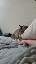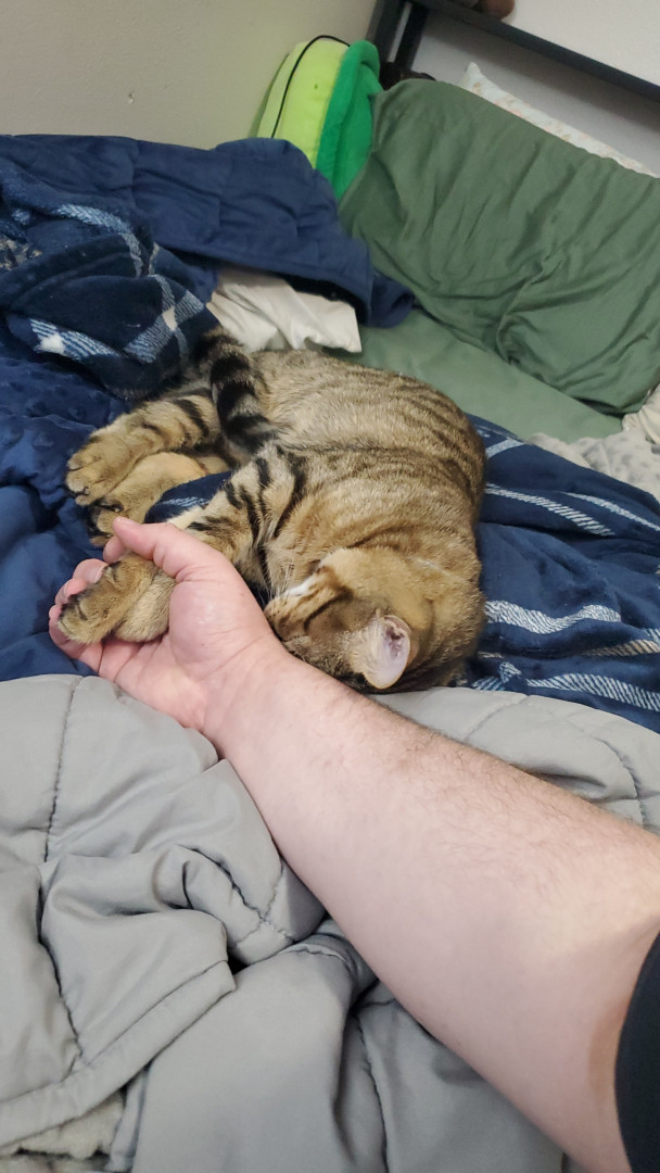 I would have to say his most unique quality has got to be how affectionate he is while still pretending to be tough the entire time! He'll let you hold him and smooch on him as much as you'd like, as long as you let him gently attack and nom on your hand while you do it, attacks that you can briefly interupt if you massage his paw pads... he loves it so much he forgets that he needs to be evil, and then he catches himself and returns to plaufully attacking your hand!