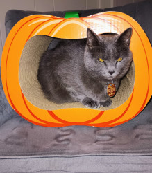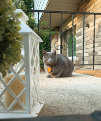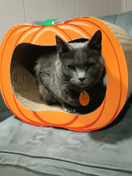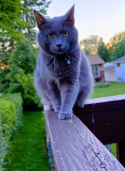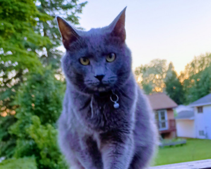 Amber is a calm, beautiful 5-year-old cat with soft gray fur and bright golden eyes, always watching the world with quiet curiosity.