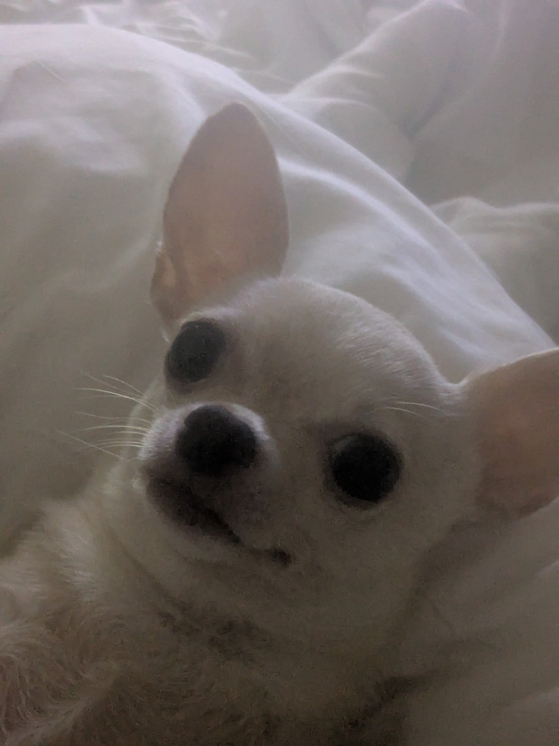 She is a fun loving fully grown 4 year old Chihuahua who loves me unconditionally and helps me with emotional support. Her name is Piper.