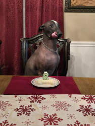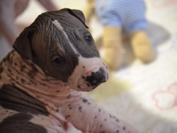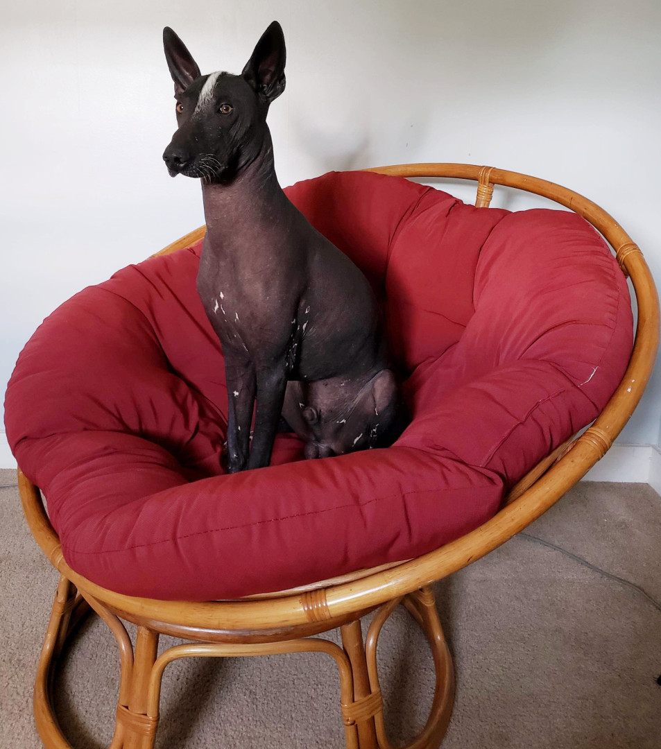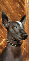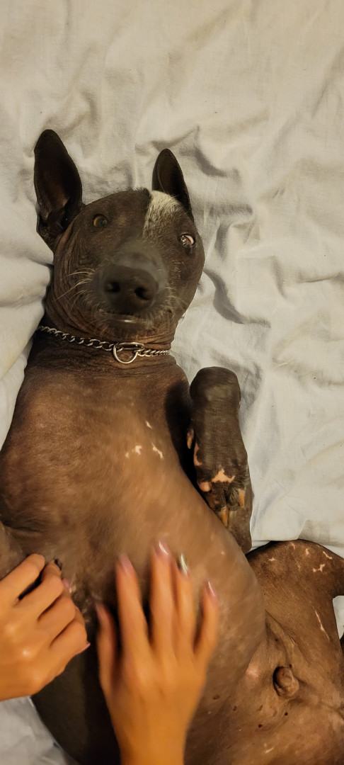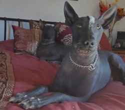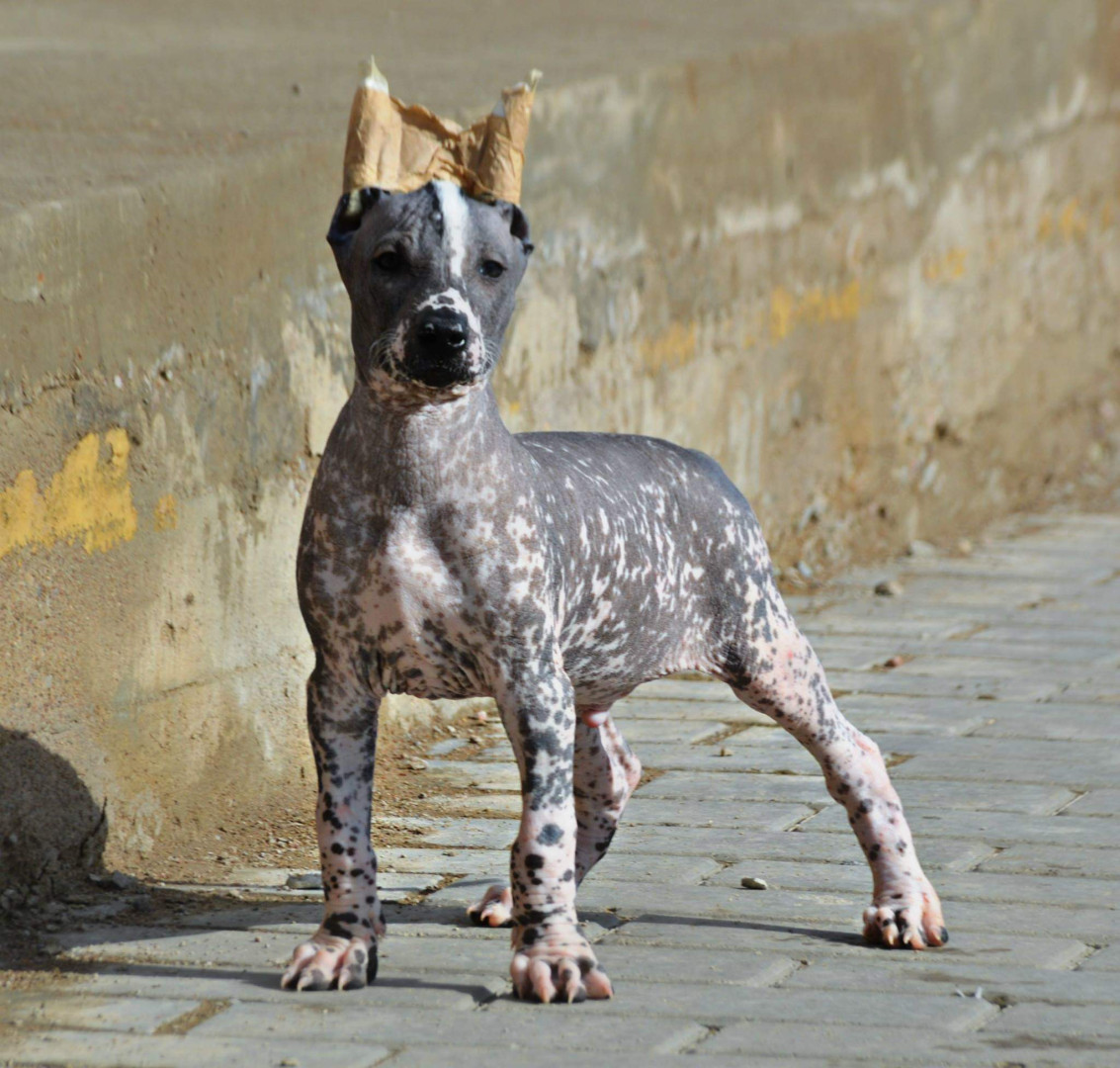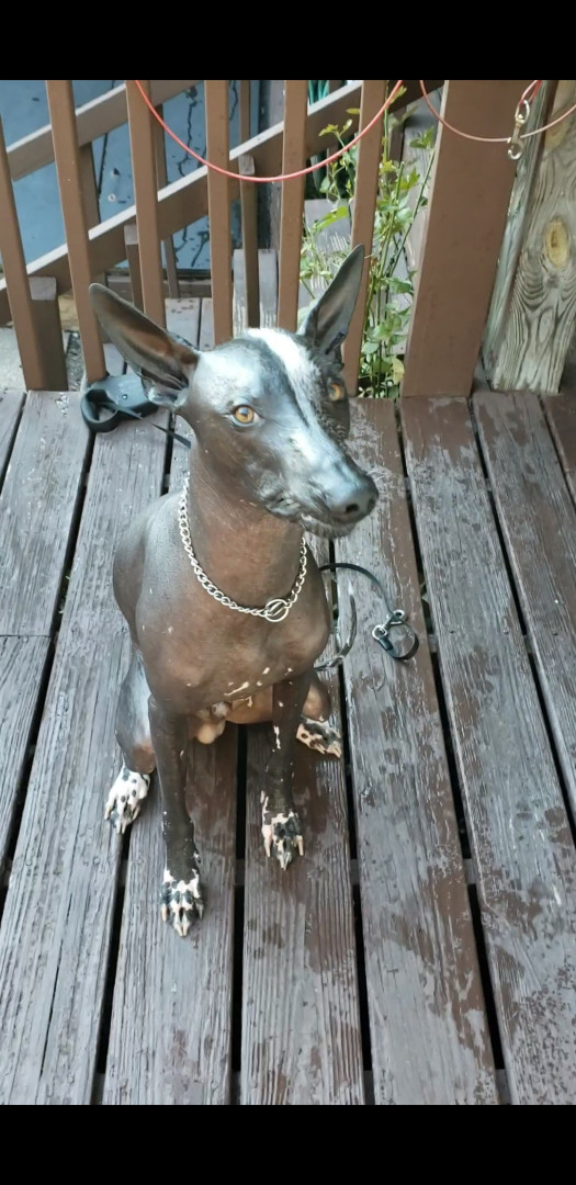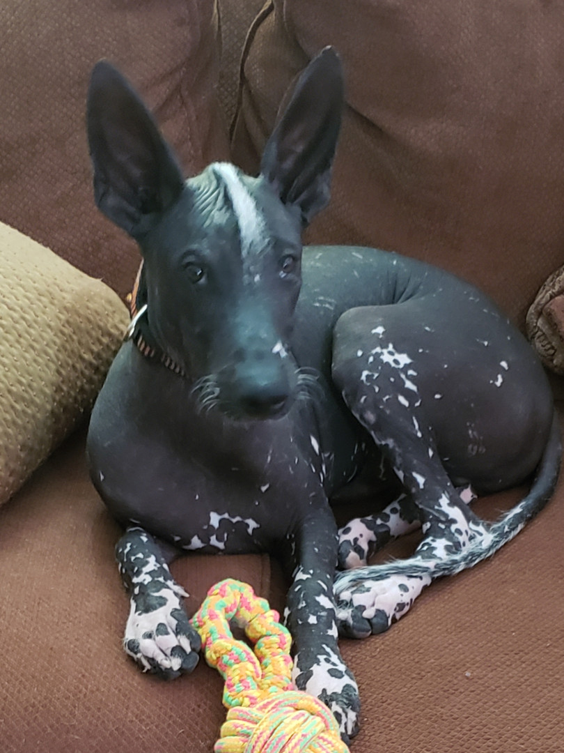 Xoloitzcuintli breed. Born white and darkened as he ages. No hair except on head,tail,and paws. Lap dog, affectionate, and intelligent.