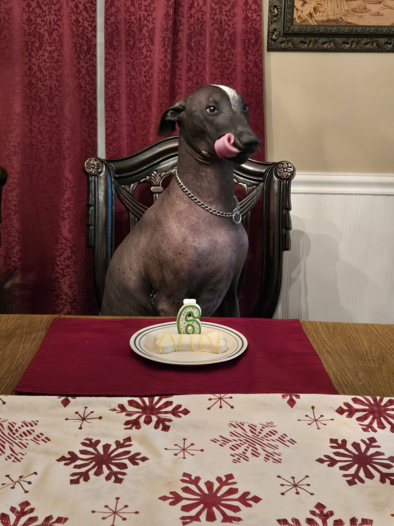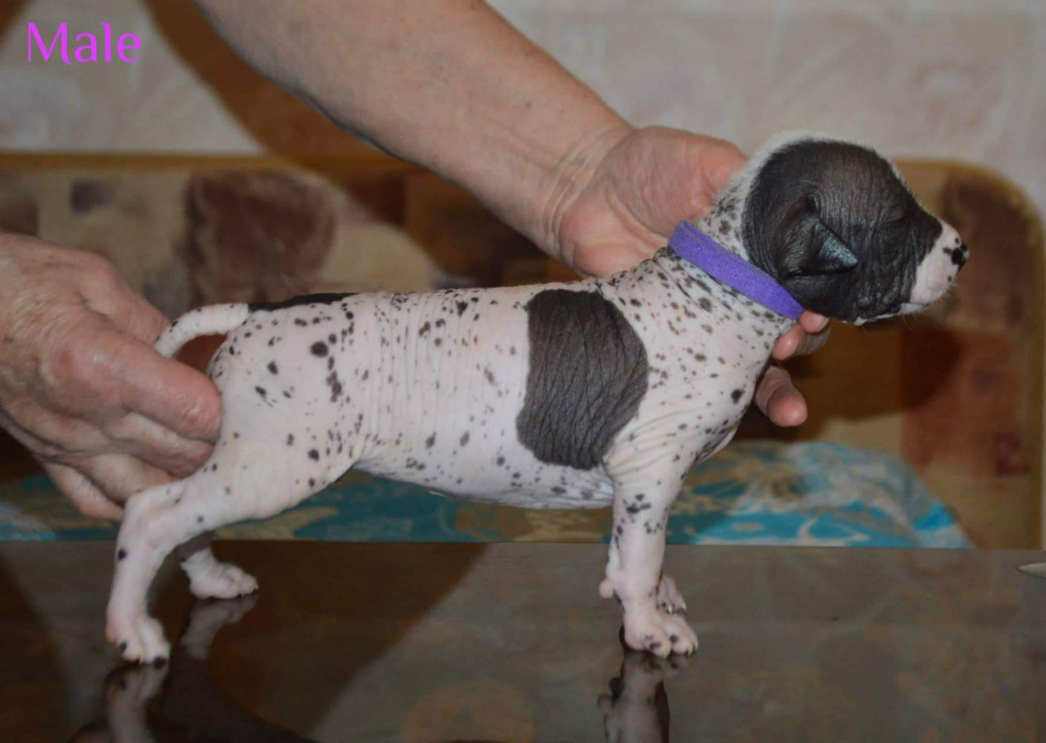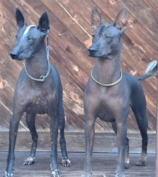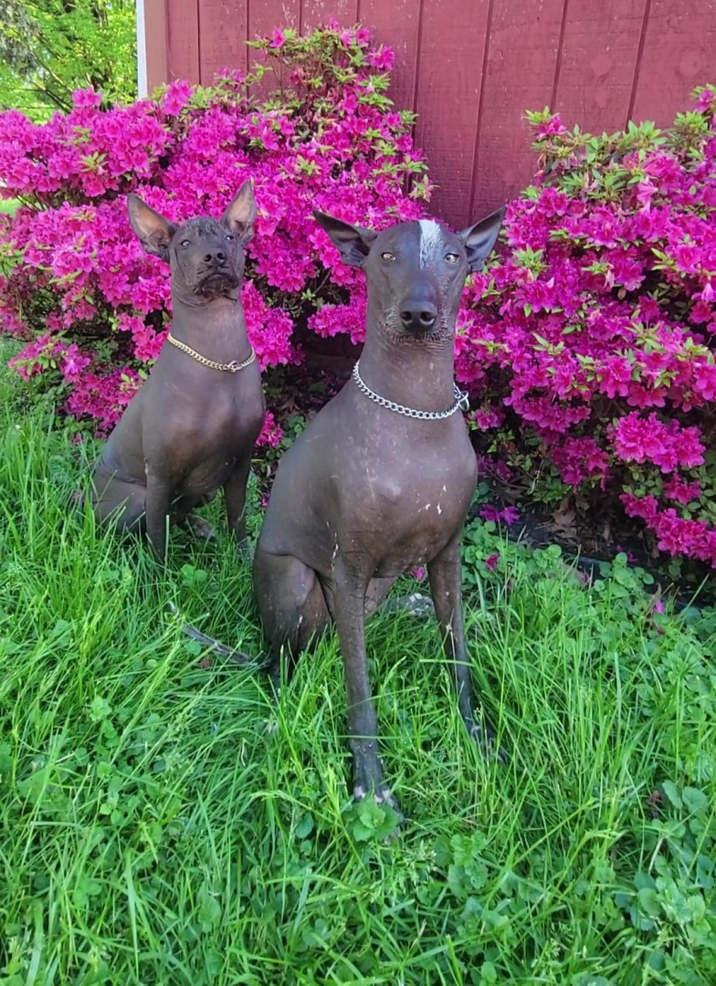 He is hairless. He was born mostly white and darken as he got older. He also has very few teeth and sometimes his tongue hangs out because of that. his breed is 2500 year old