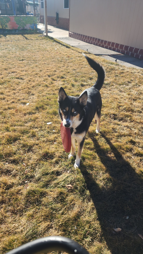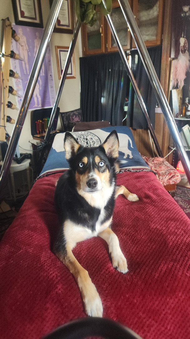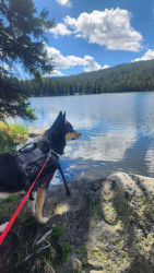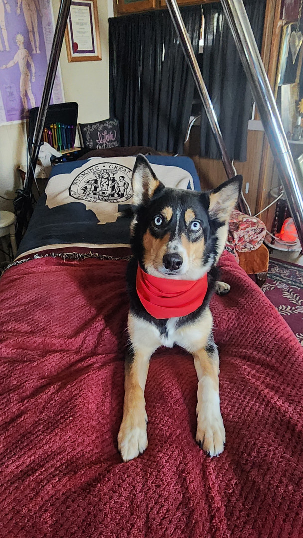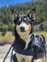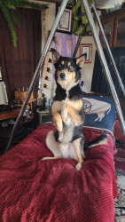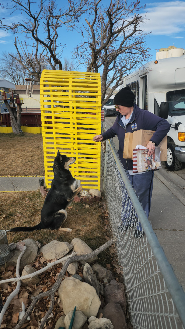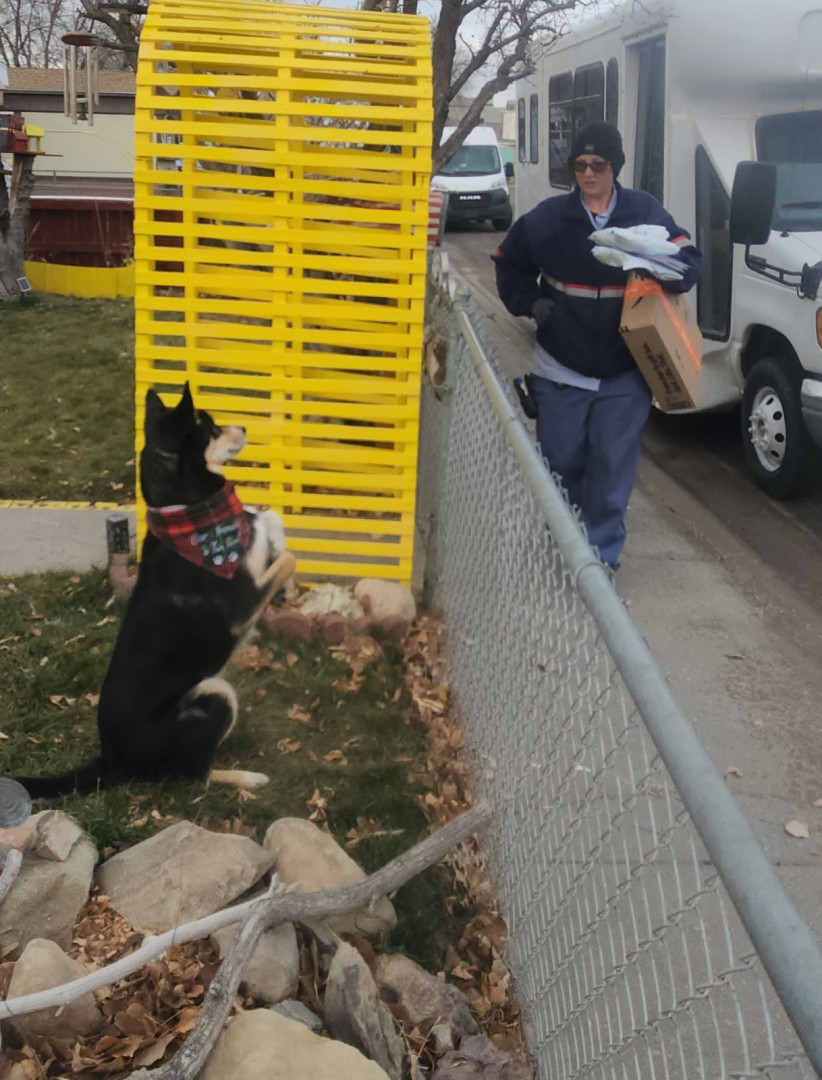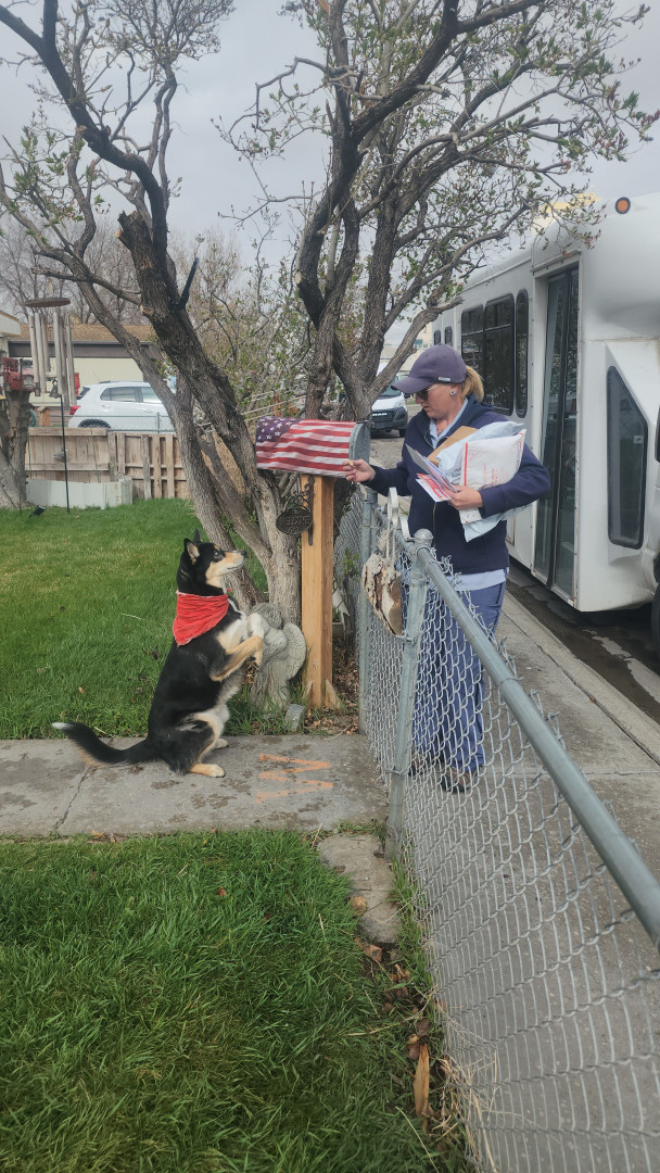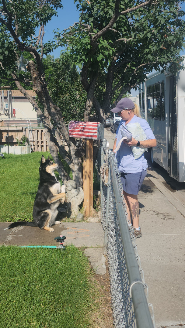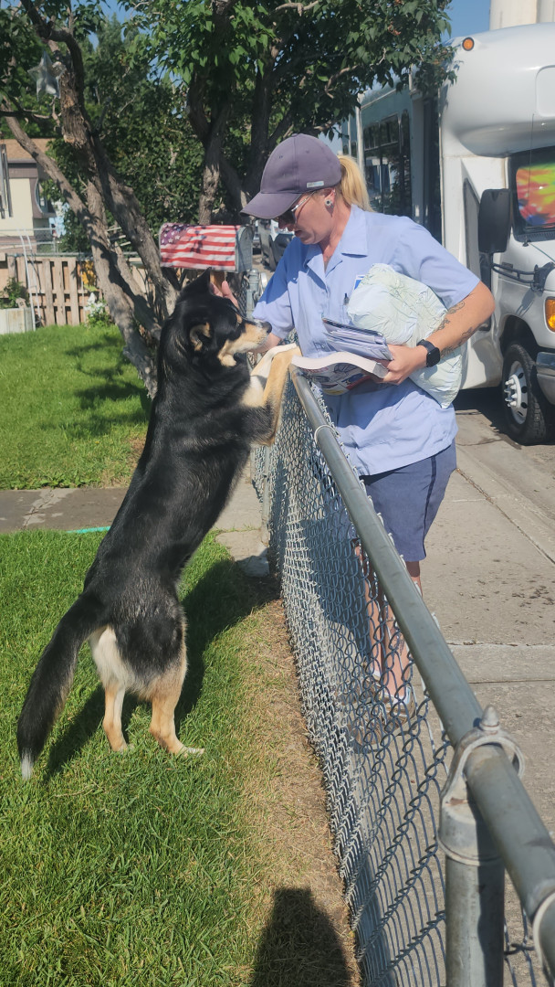 Aoki is a rescue who actually rescued me. Aoki is a natural therapy dog, he loves and leans on all he meets. He loves his Mailcarrier most