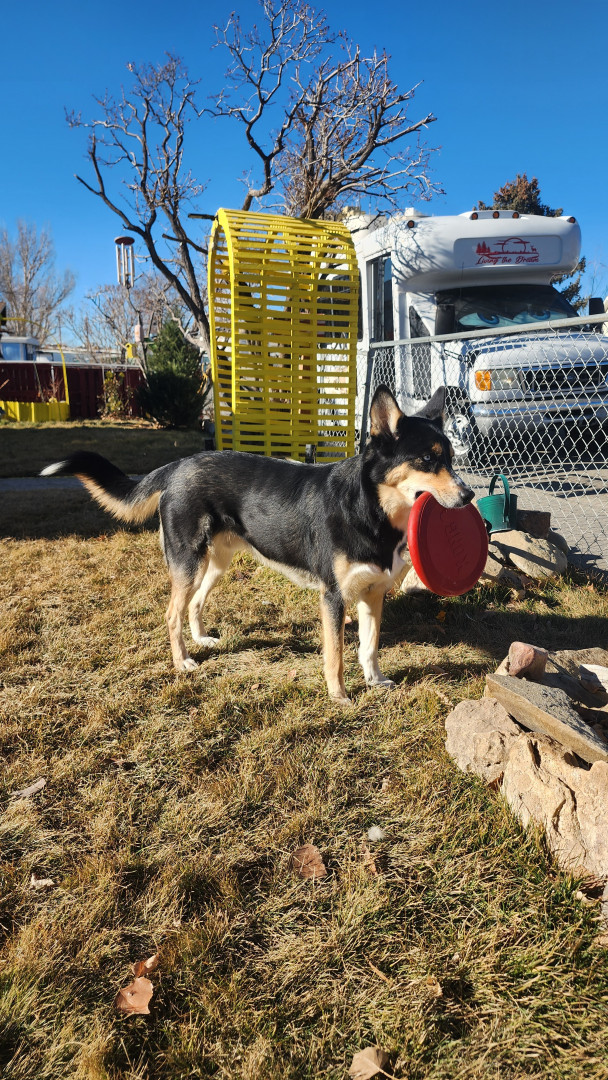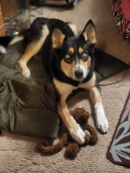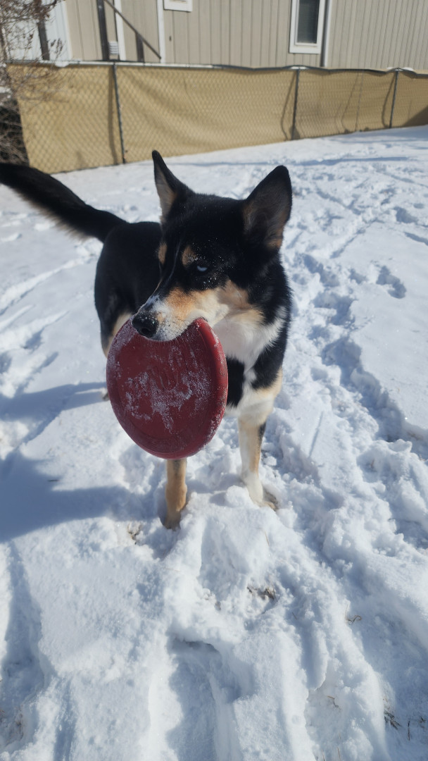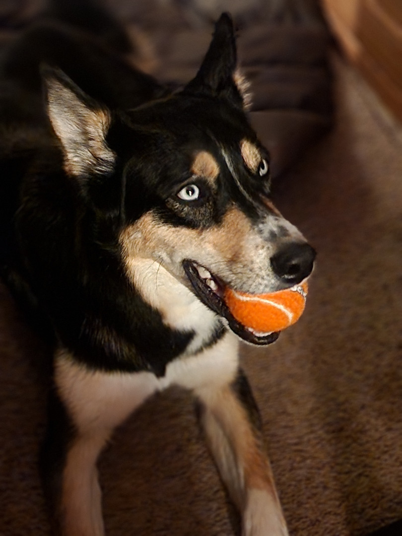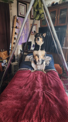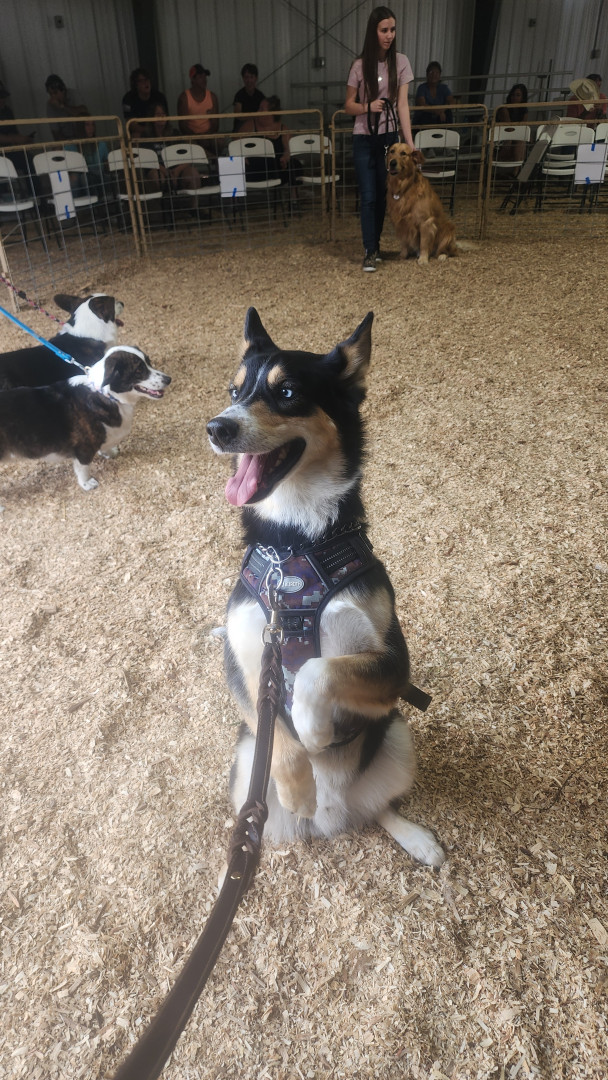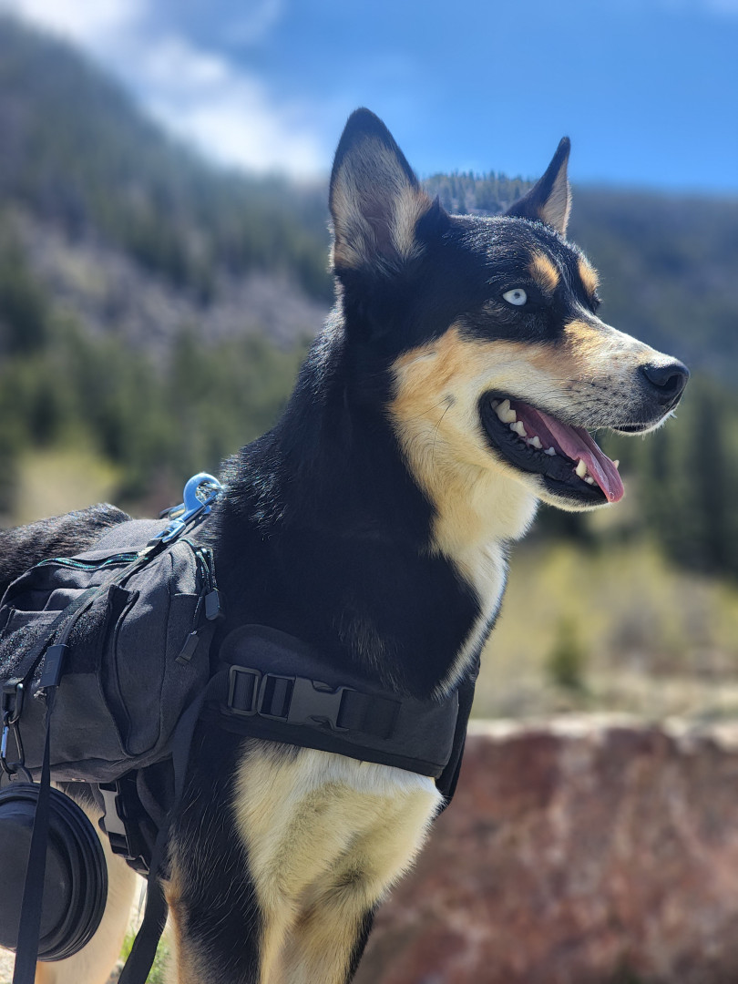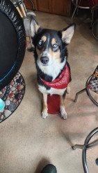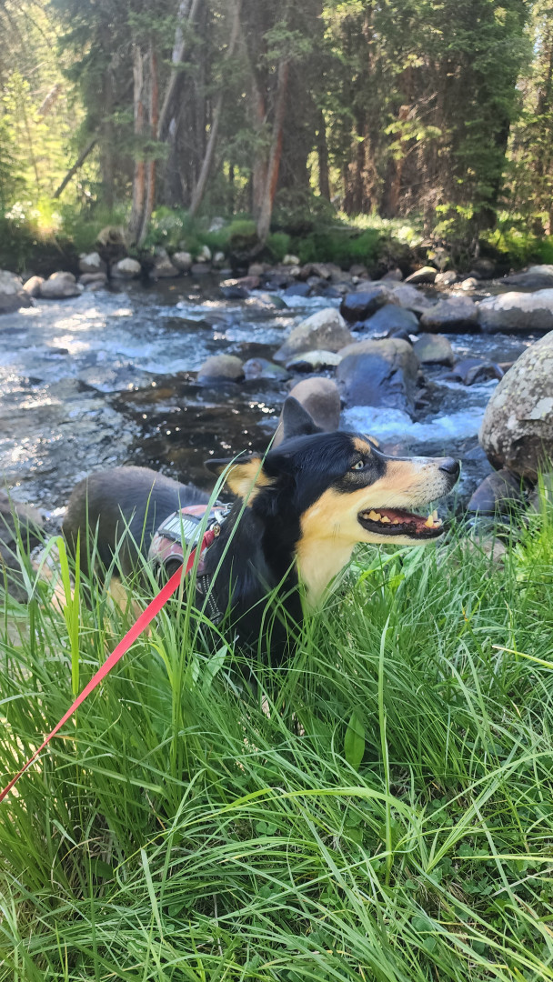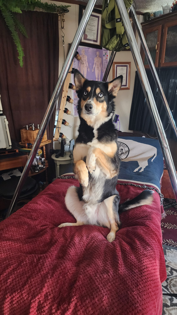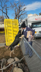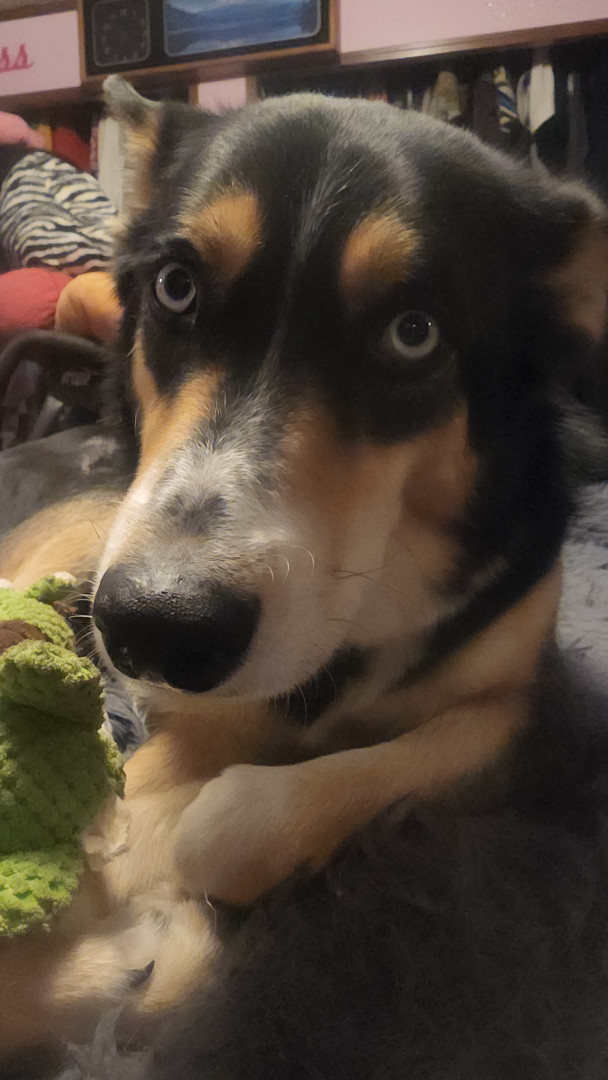 Aoki is a rescue who actually rescued me. Aoki is a natural therapy dog, he loves and leans on all he meets. He loves his Mailcarrier most