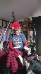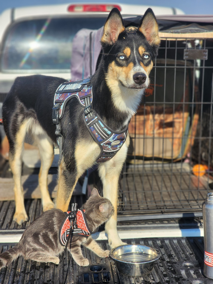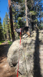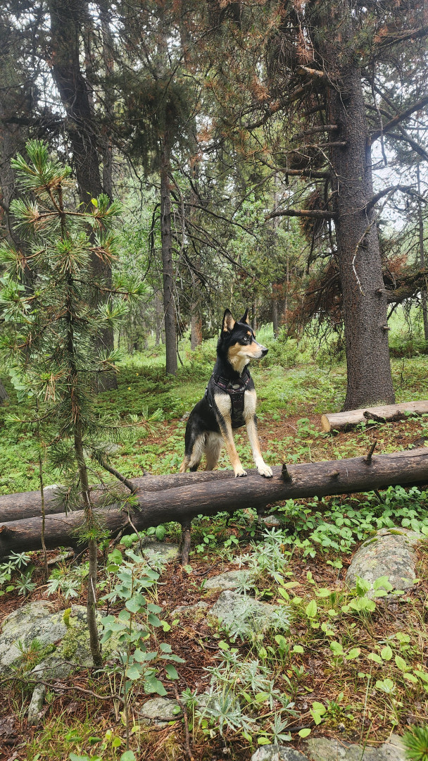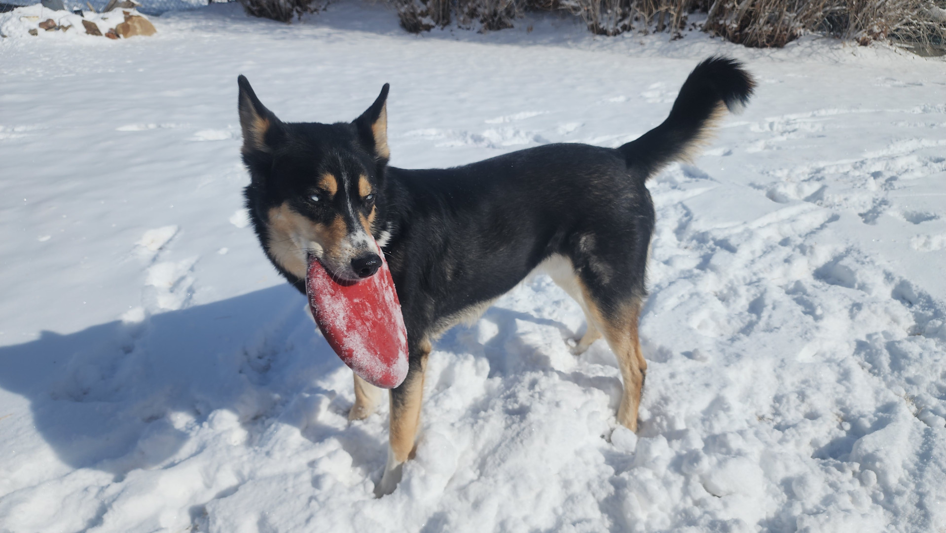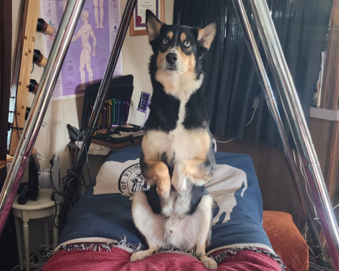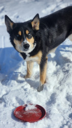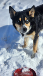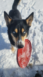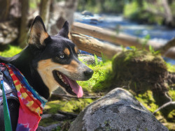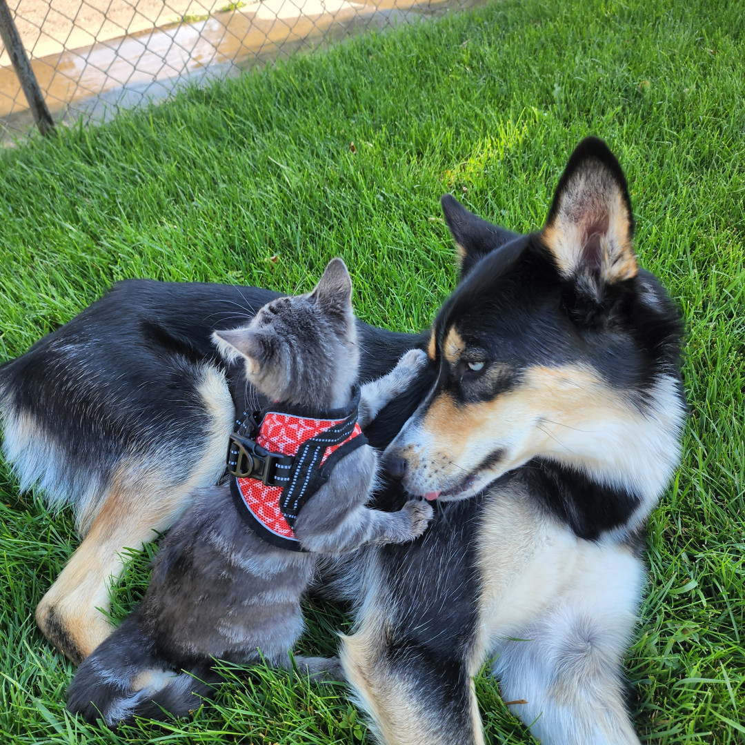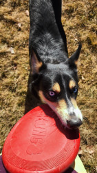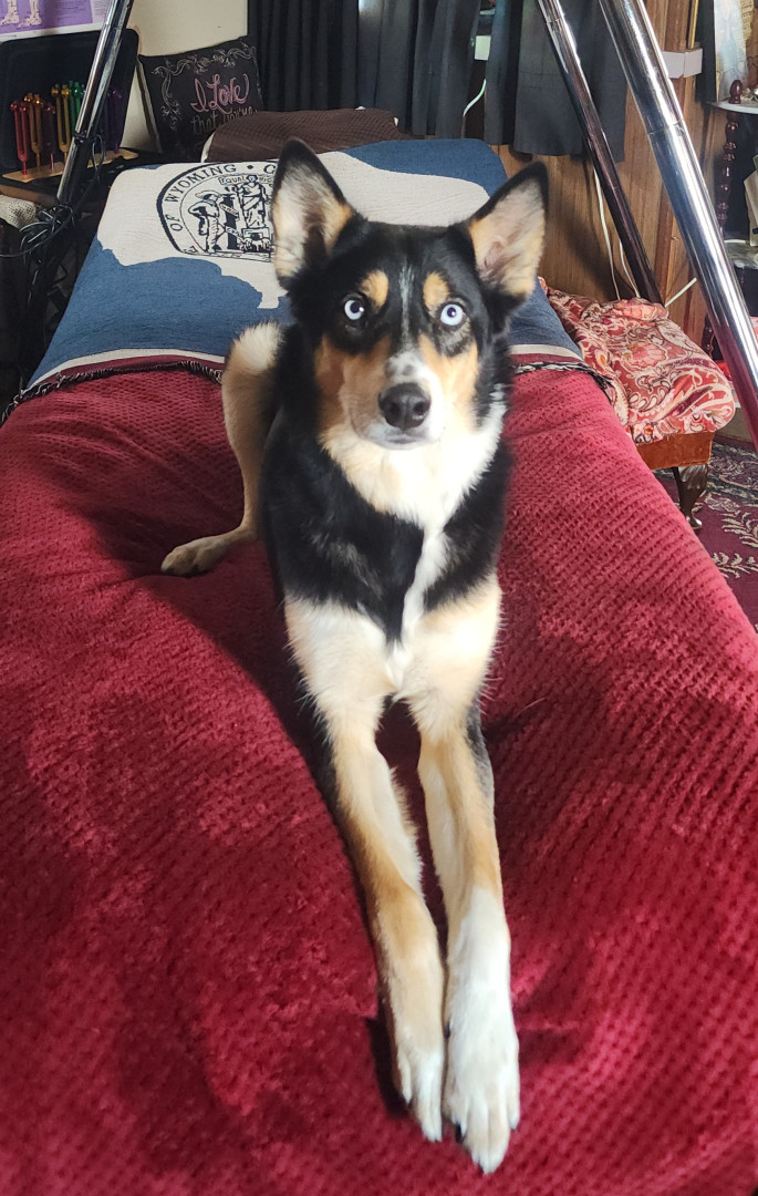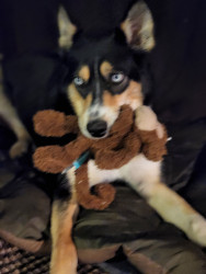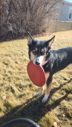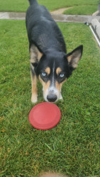 Aoki is a rescue who actually rescued me. Aoki is a natural therapy dog, he loves and leans on all he meets. He loves his Mailcarrier most