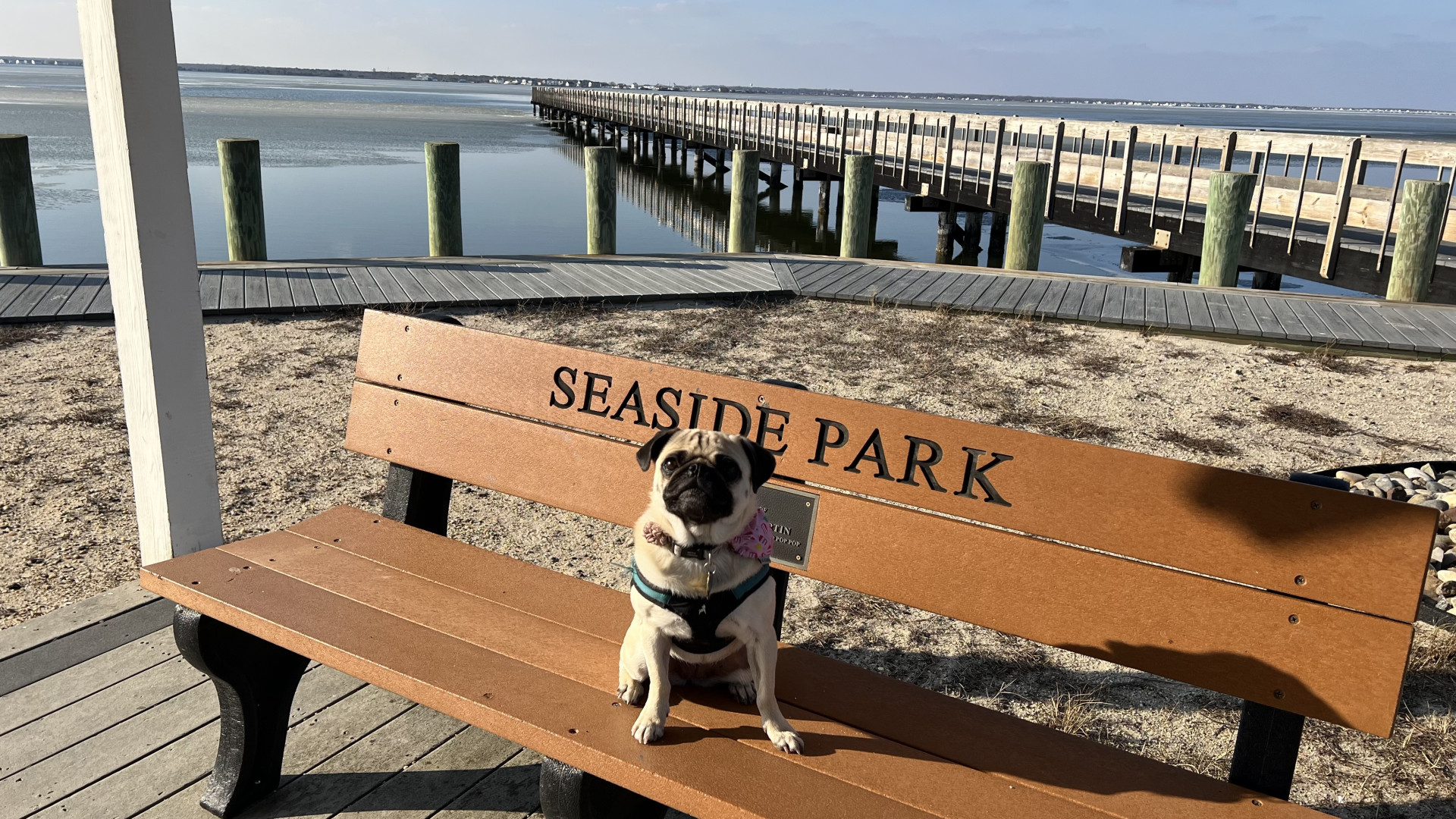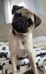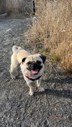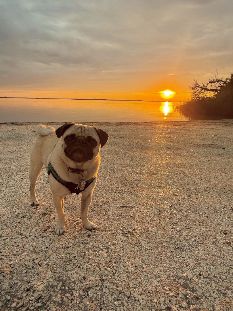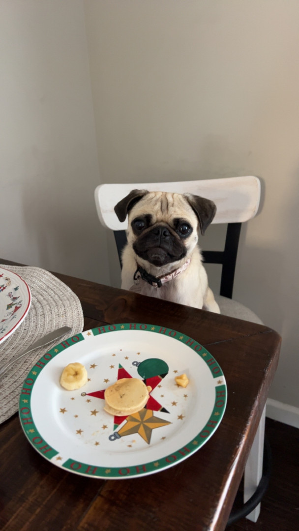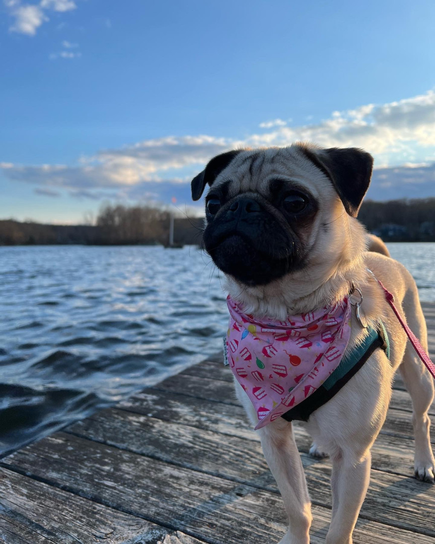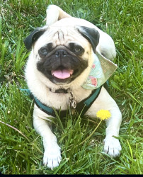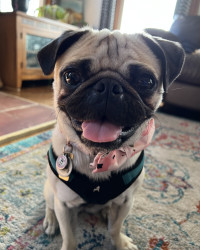Appa is our 4-year-old pug powered by sass, snacks, and snuggles. She brings joy and smiles to everyone she meets!