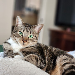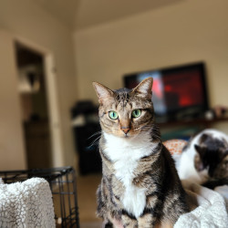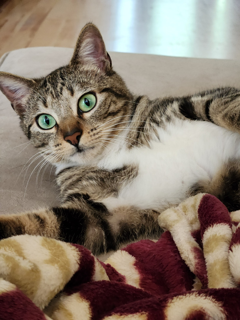 Archer has dazzling green eyes, loves to cuddle, and proudly calls for me when she's defeated her favorite toy - my best cat ever!