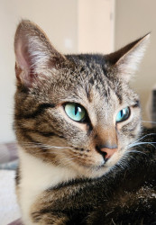 Archer’s most unique quality is her heart. She came to us as a stray kitten, quietly keeping me company in the garage while I worked. We even thought she was a boy—until she surprised us with four kittens. Despite her tough start, she’s incredibly sweet, gentle, and trusting. Add in her stunning, unforgettable green eyes, and Archer is pure magic.