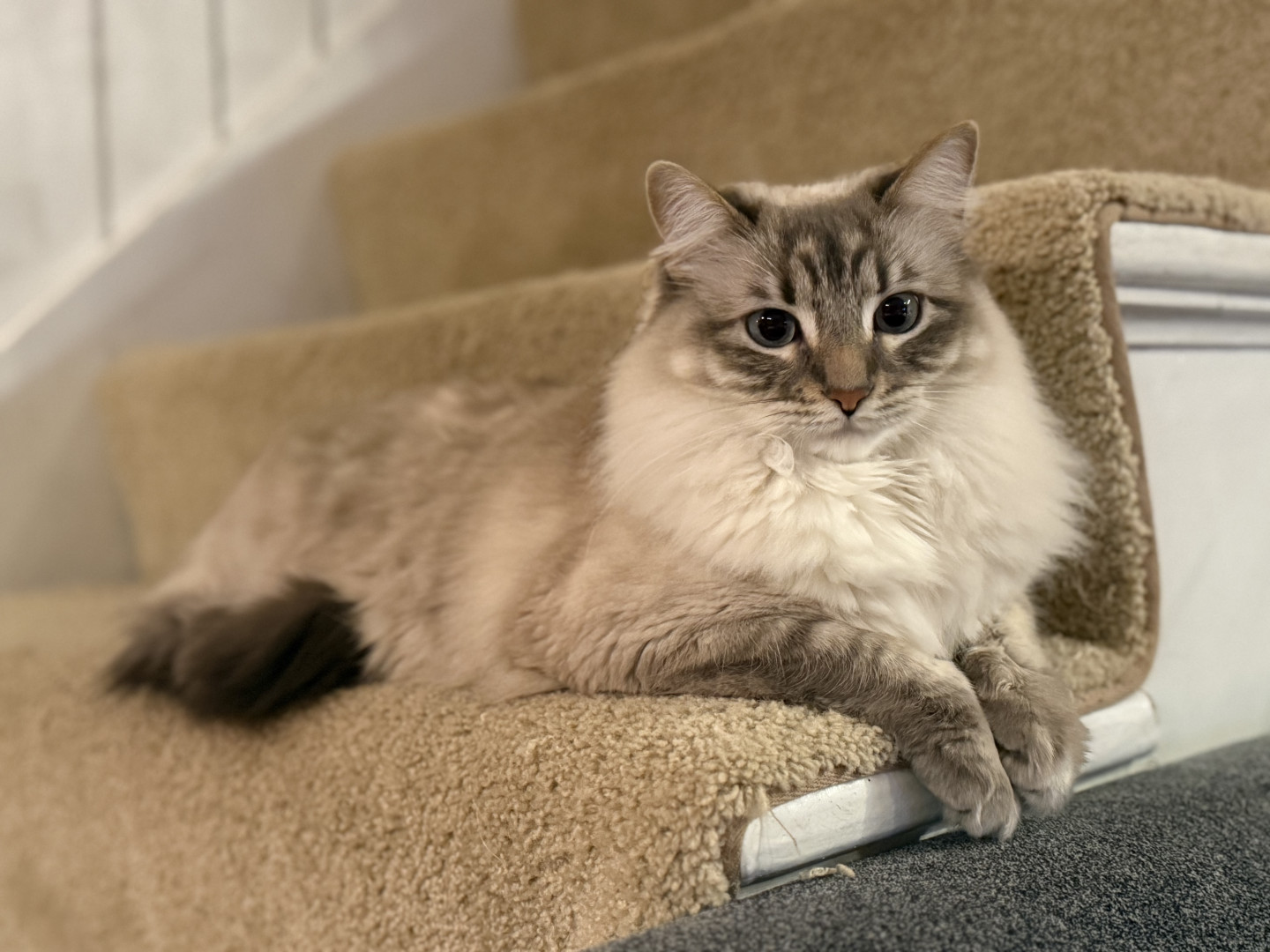 Aria, a ragdoll/Siamese rescue, loves squeaking for attention, string, and riding in doll strollers like a beauty queen on a parade float