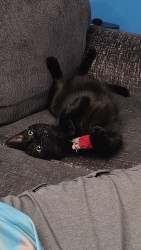 She's an adorable little dork of a black cat who loves to play with both her humans and her cat siblings all over the house, but she can also be a loving, cuddly little ball of fur.