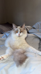 He loves to lay by the heater and whenever I hold him he lets out a hmm instead of a meow not like any other cat I’ve owned.