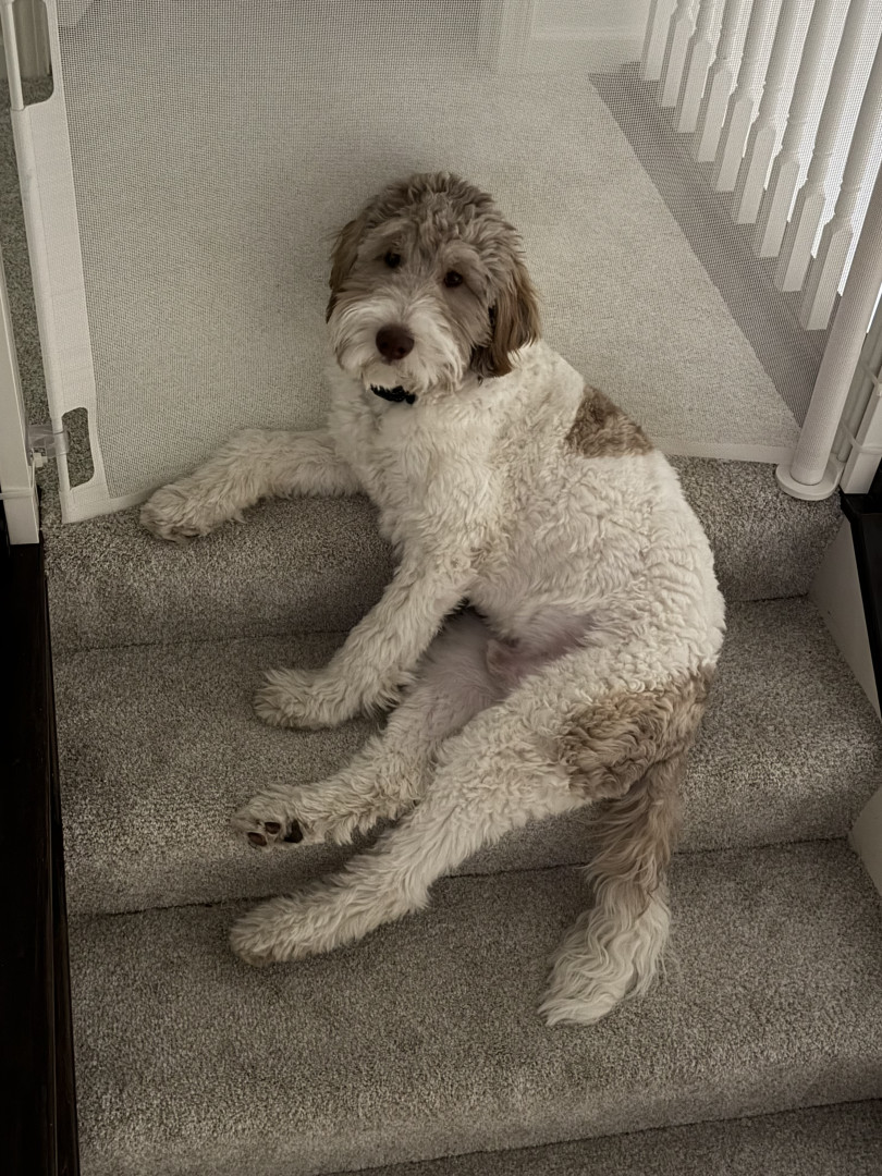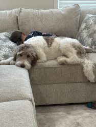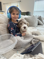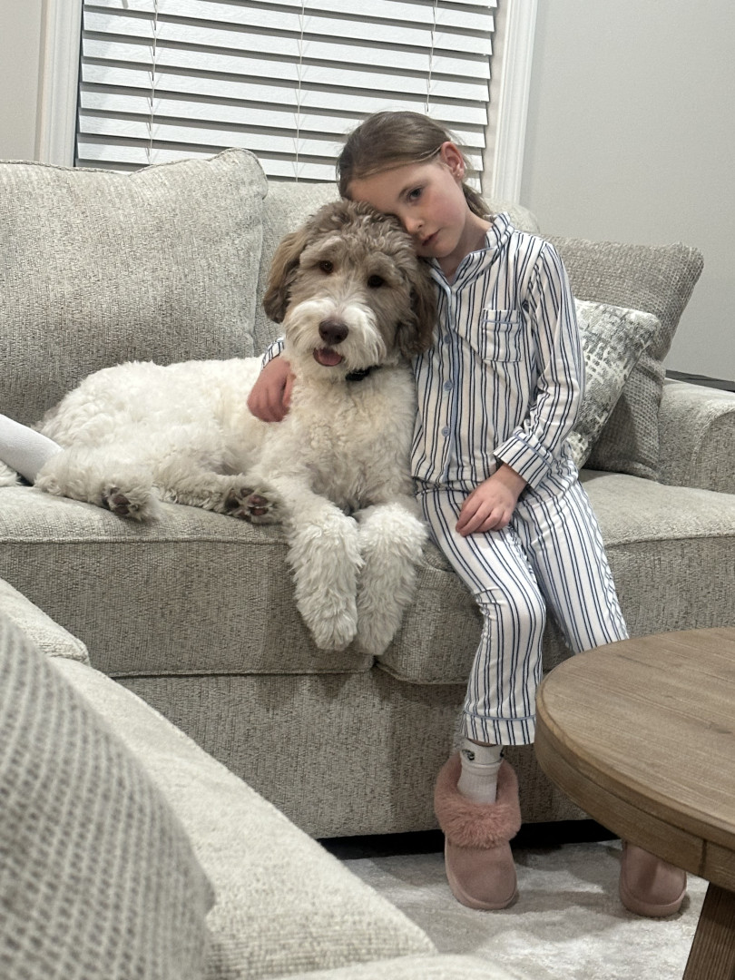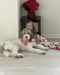 Since the day we brought Artie home, he has been the easiest puppy. He knew how to shake (right and left paw on command) within his first two days (at 8 wks old). Artie is incredibly laid back & just LOVES playing w/ his two human sisters ( 6 & 8 yo) and his dog sister (Maggie- 8 yo golden doodle). When our 8 yr old daughter was sick, he did not leave her side until she was better. He laid on the couch, cuddling with her until she was better; proving his utmost devotion to his humans.