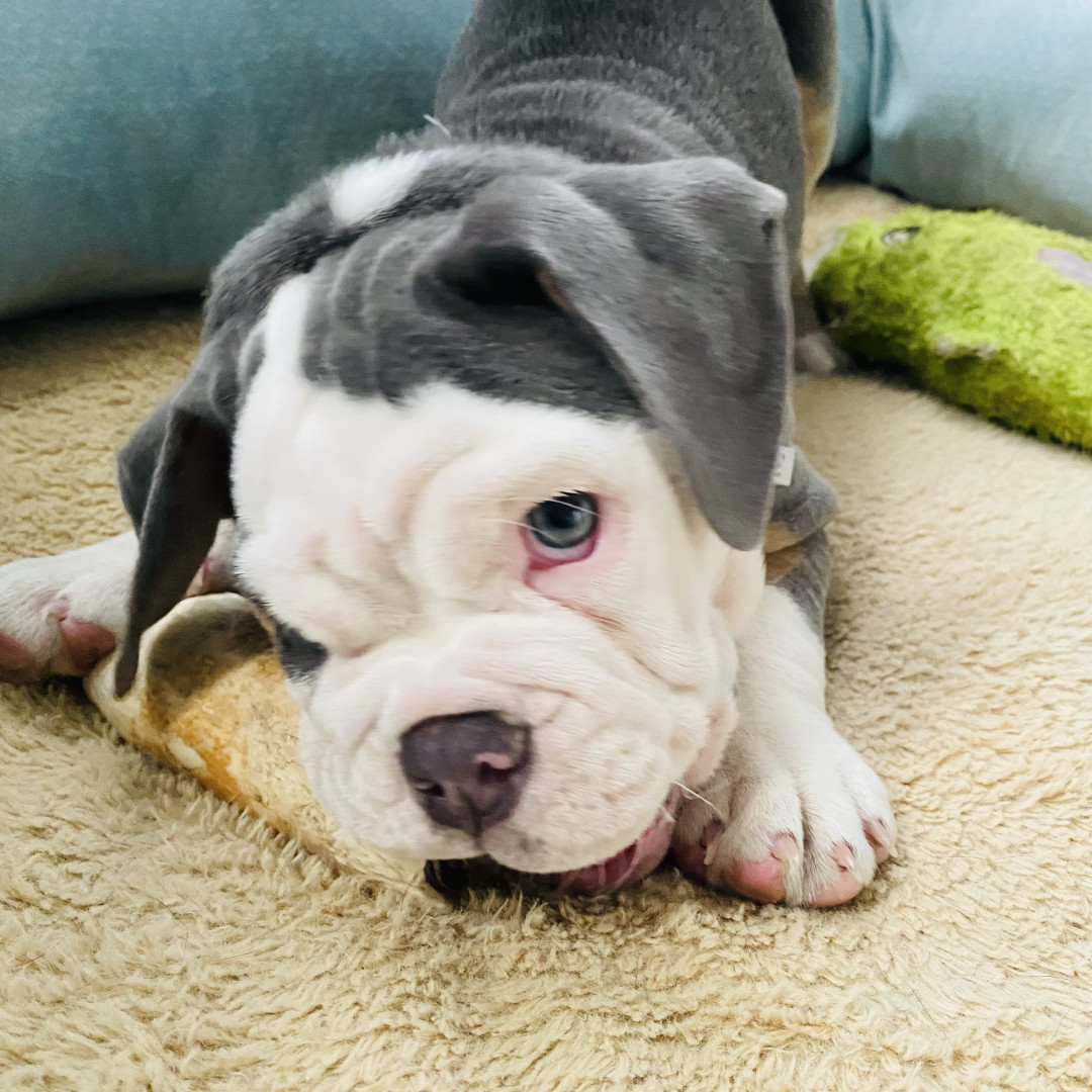 Any toy that’s stuffed, her favorite treat is Peanut butter, fill up a kong and she’s a happy pup.