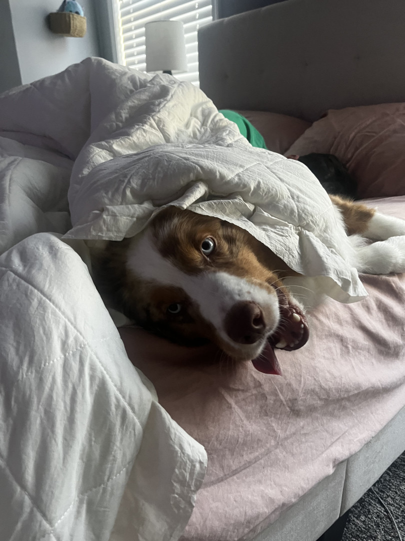 Our crazy boy loves stealing socks, jumping up to kiss you, wiggling his butt, and dragging his dog bed across the house.
