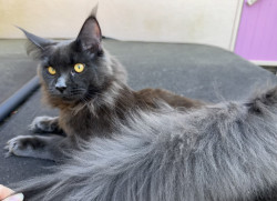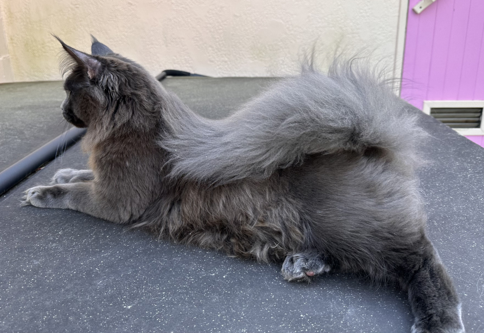 Ashiron is unique in a way that he interacts with us and is so much like a child. He knocks things off the counter so you pay attention to him. He wants to play chase or hide-n-seek. He comes when you call him and sleeps with me and best of all, he’s a Maine Coon so he’s bigger than most small dogs and is a gentle giant.