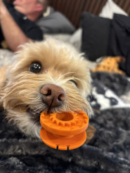 He is so loved by everyone he meets, and known for being an extremely happy boy! His groomers love watching how he greets me when I pick him up, which involves him crying, whining, and climbing on my head, as well as licking and biting my nose! He has the sweetest heart, sleeps in bed with you all night, and has never destroyed a single piece of furniture or household item. He’s great with all size humans, and loves running around with other dogs (if they choose to try and keep up!)