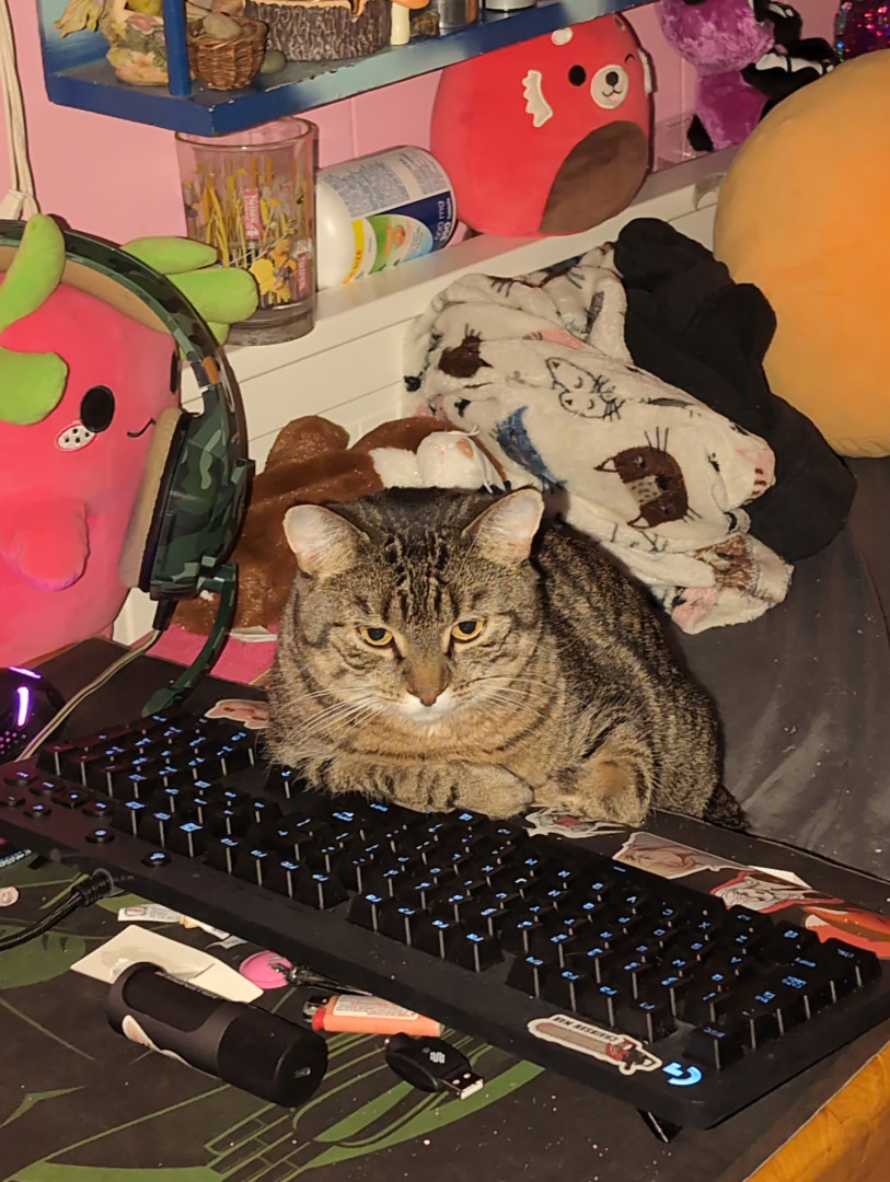 She likes to lay like a rotisserie and she meows with her tongue out like a goat!!