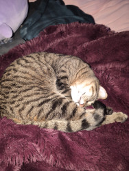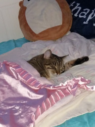 She's a very cuddly and curious cat. She likes to drink from glasses, snuggles like a teddy. She likes to talk a lot and she loves boxes