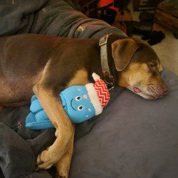 A squeaky blue Santa octopus. He will toss it in the air and catch it with his front paws.