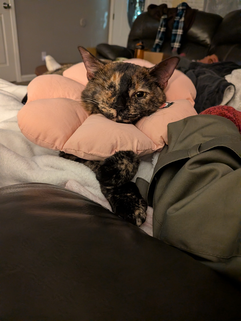 I think her missing eye definitely is noticable on her plus she has a tortoiseshell color that's stunning