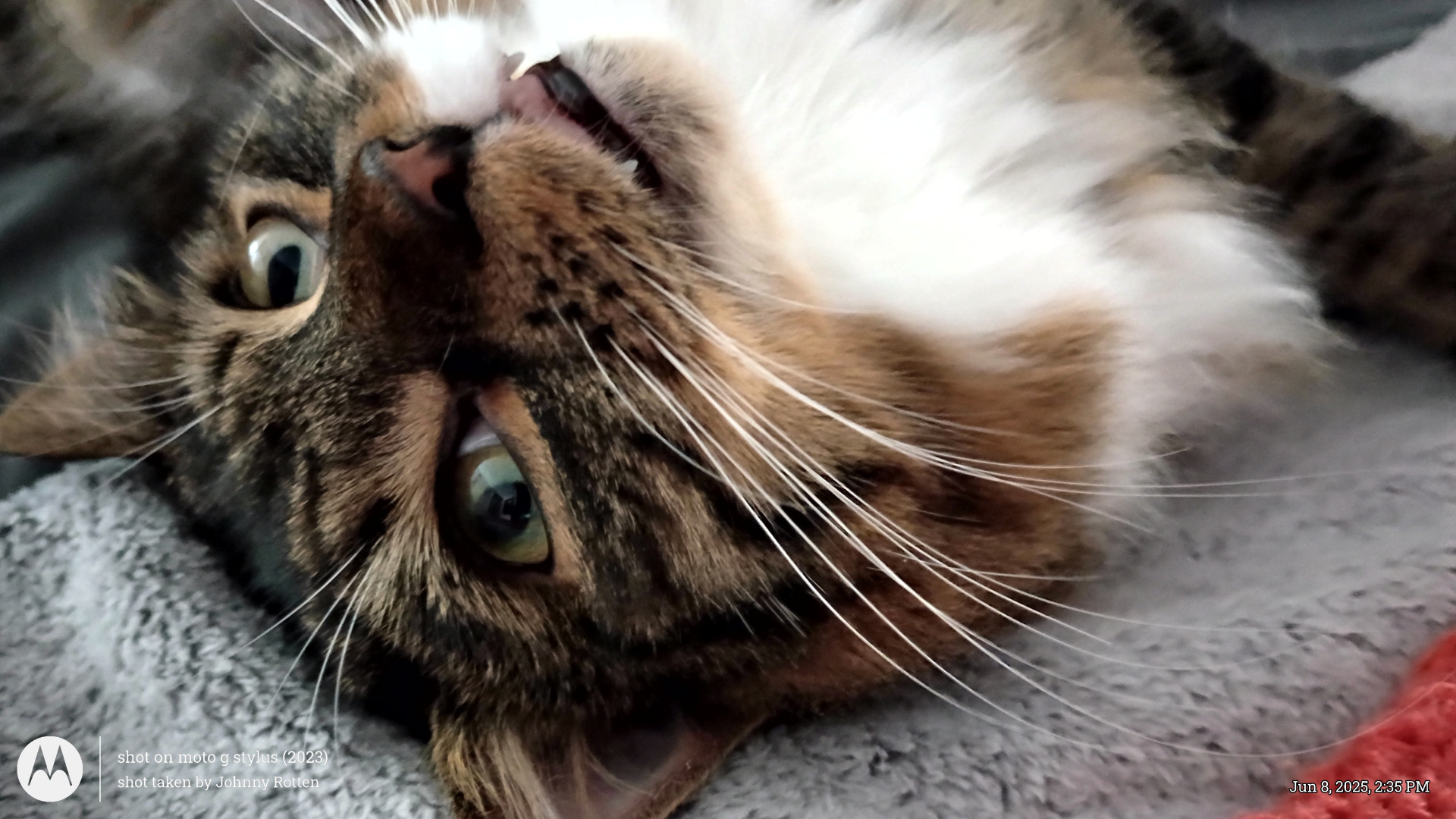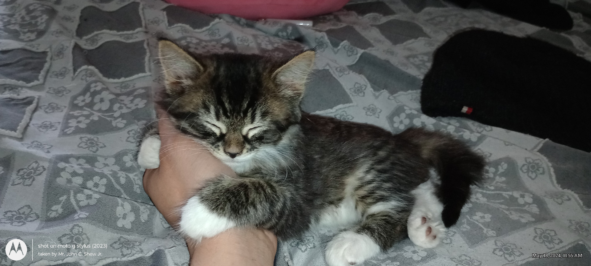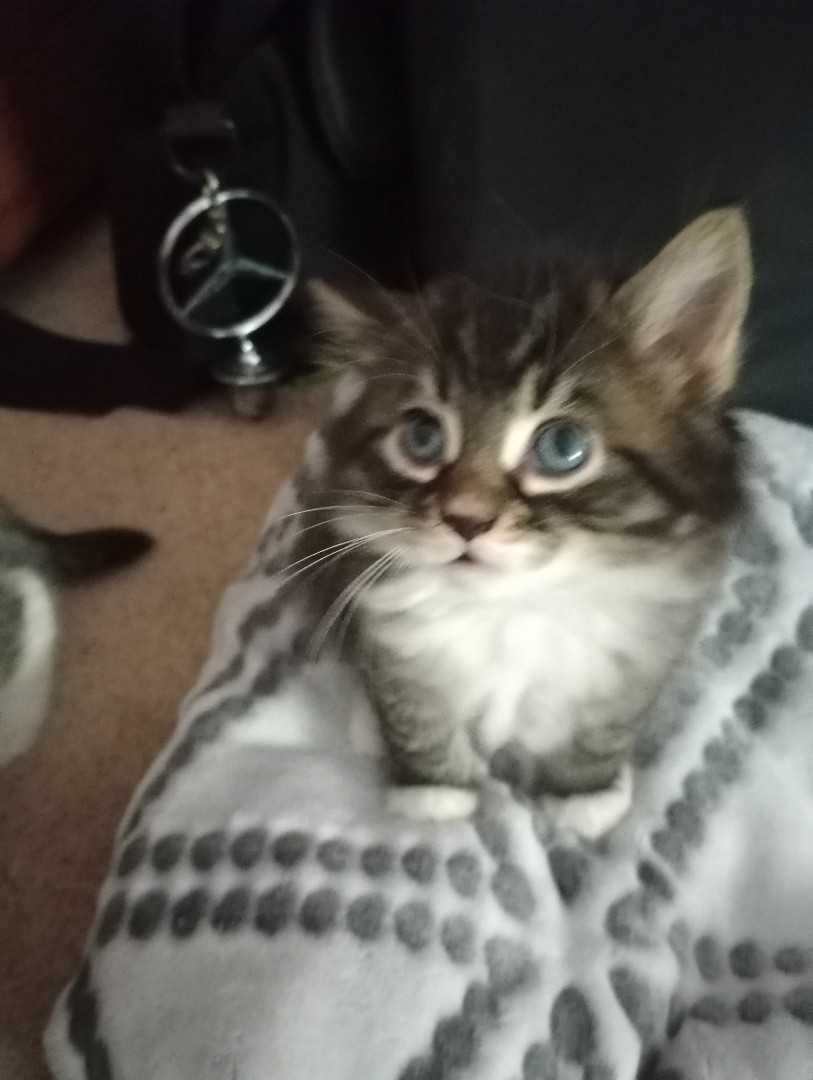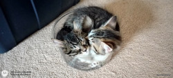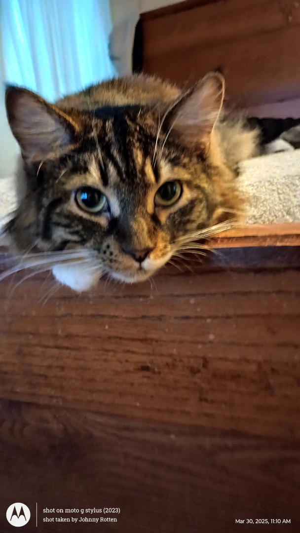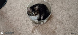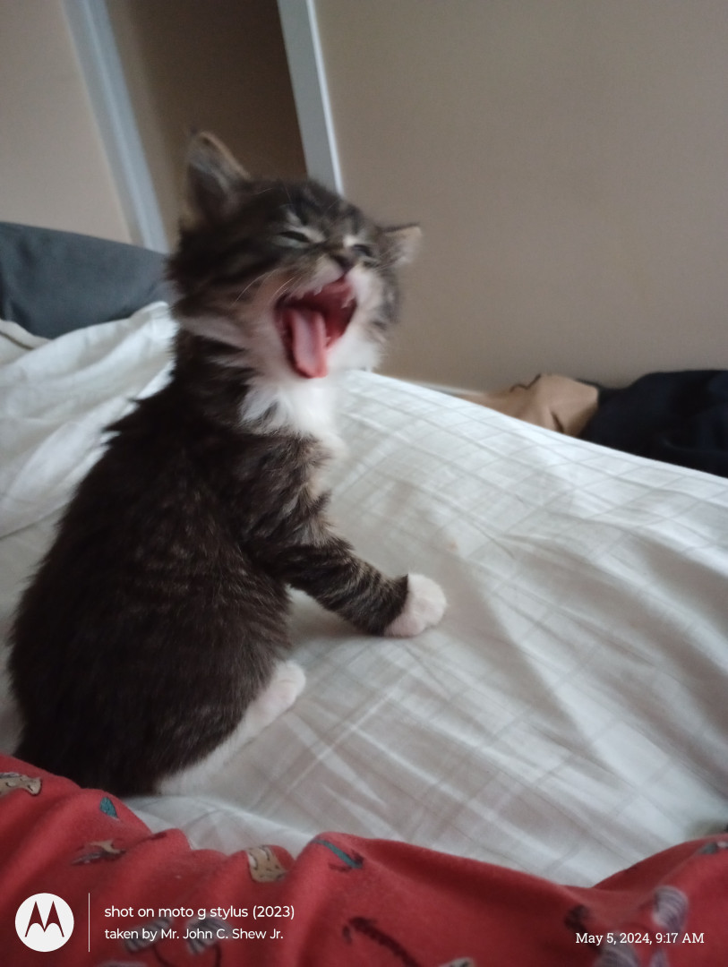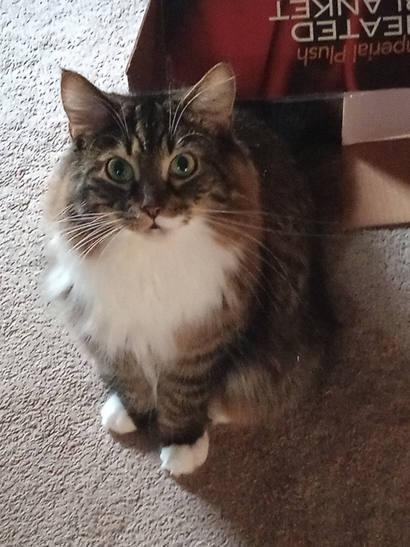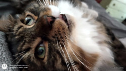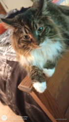 He's a cute as can be, cuddly, lovable, young kitty. He's 1 1/2 years old and half Maine Coon.