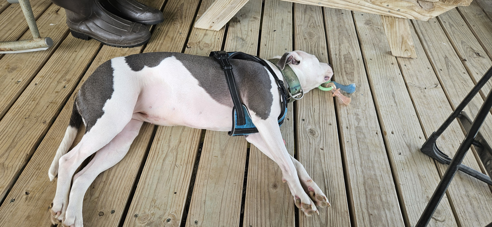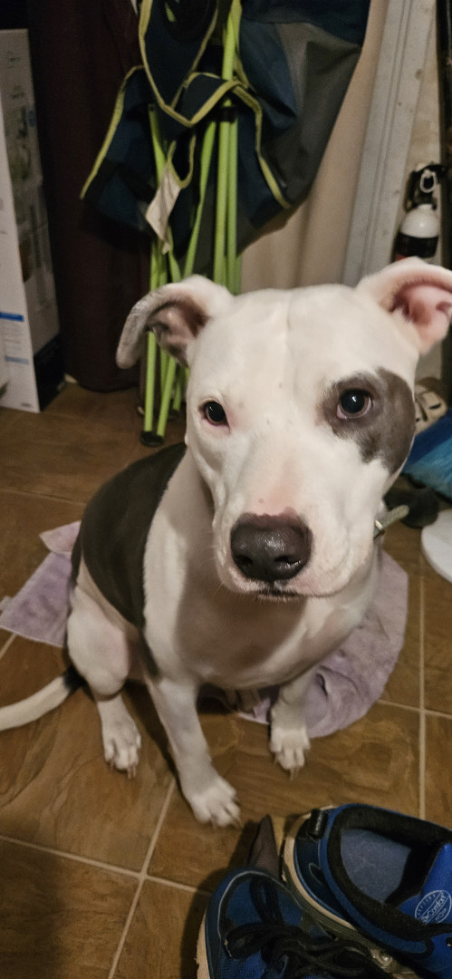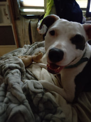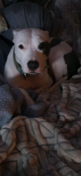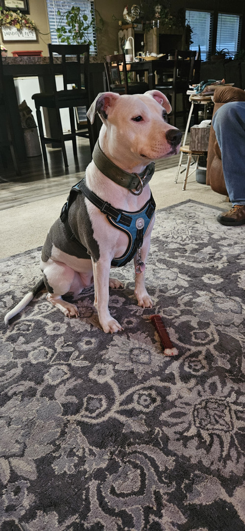 Babe was rescued from an animal shelter. She is an American Pit Bull Terrier and she loves everyone and other animals. She is a great service dog and she does her job amazingly great.