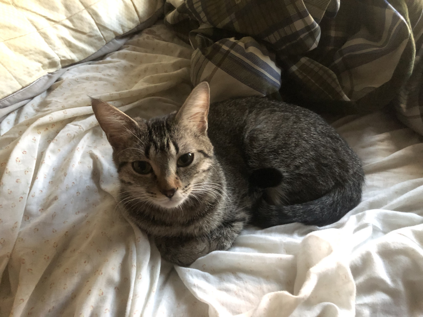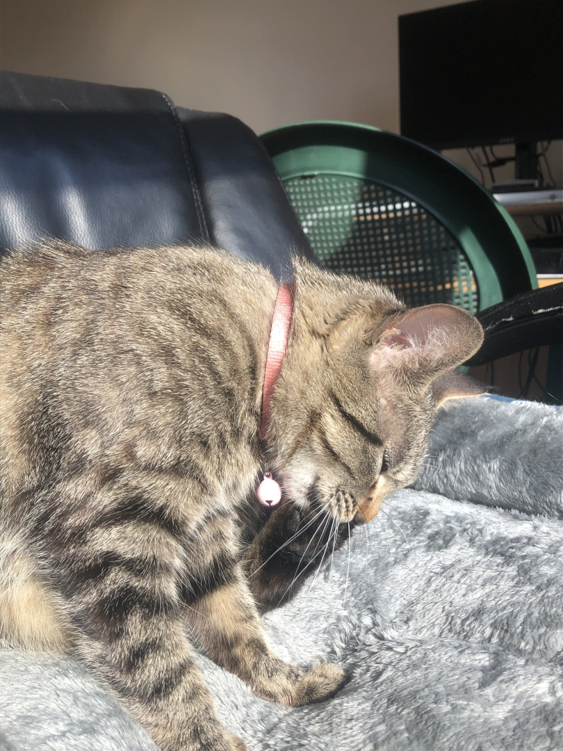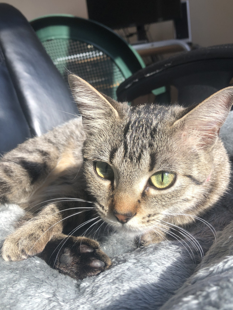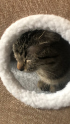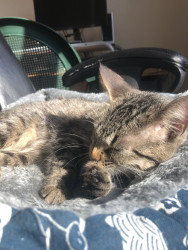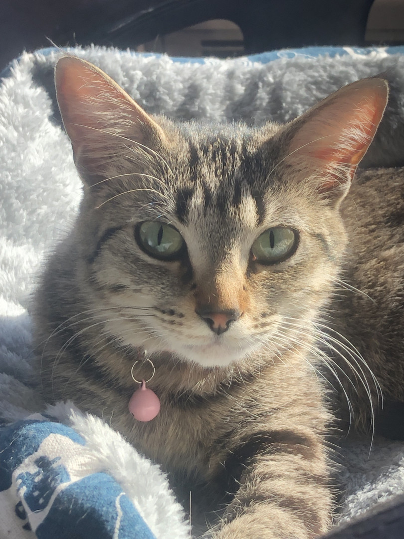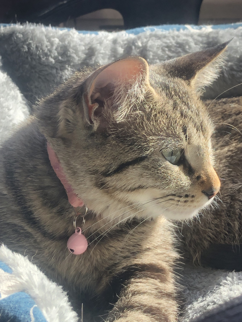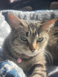 My pet female cat, Baby, is a two yr old cat who loves cuddles and pets. She softly purrs when being touched by loving hands.