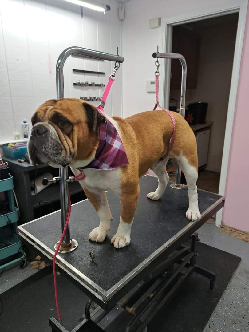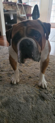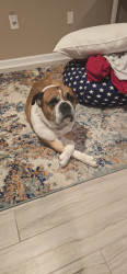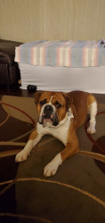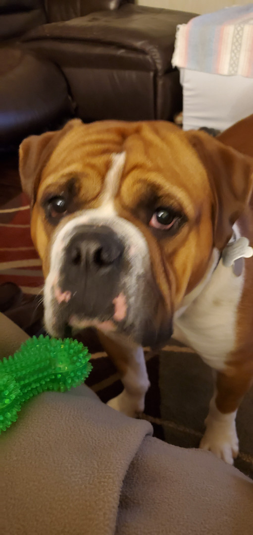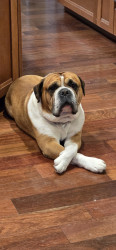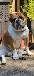 Bailey is an Olde English bulldog. He weighs 108 pounds and stands at 19 1/2 inches tall. He is the center of attention indoor and out!