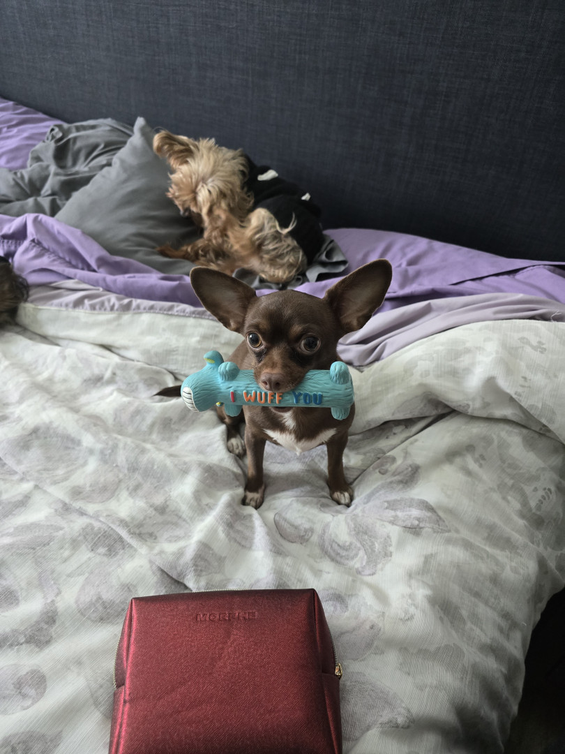 Learn MoreA rubber green weiner squeaky toy. She won't let any other dog touch it. And her favorite stuffed hedge hog that she sleeps on during the day