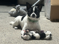 Learn MoreBandit’s favorite toy is his stuffed monkey he shakes it and throws it. His other favorite is the little rubber squeaker that has a face on it he holds it in his paws and then rolls over on his back.