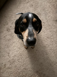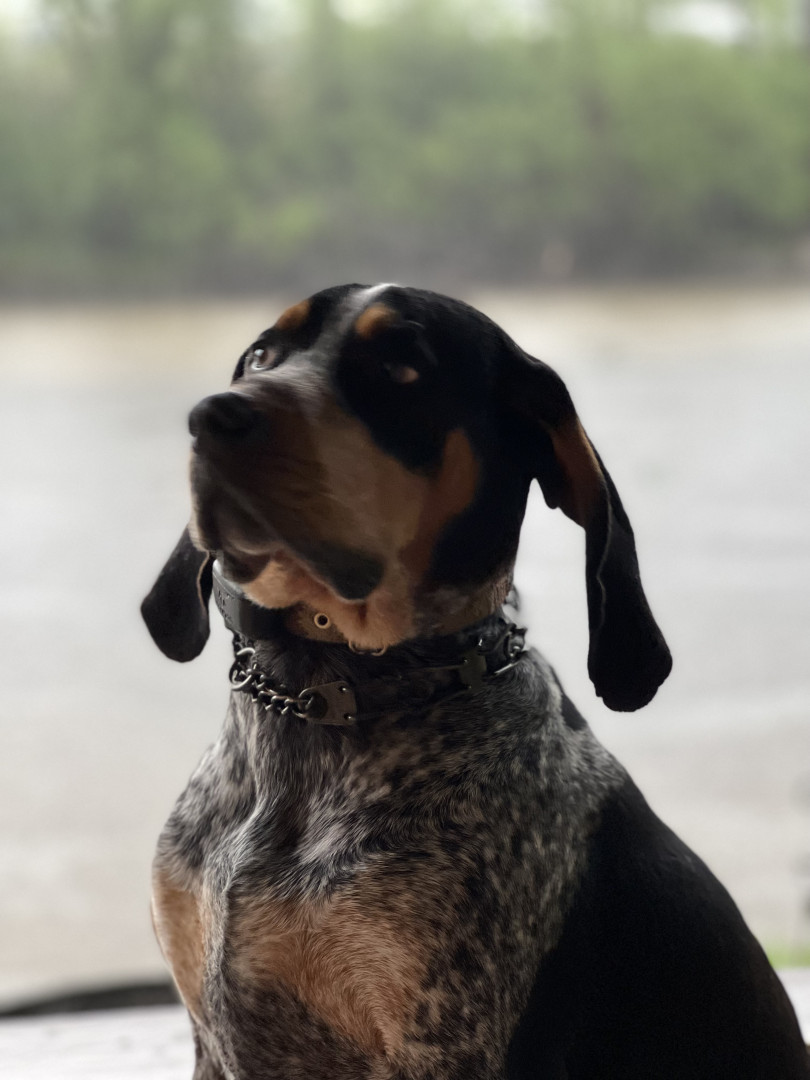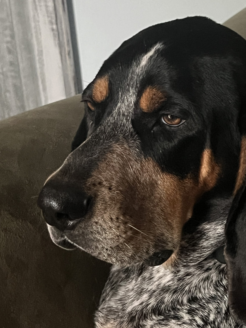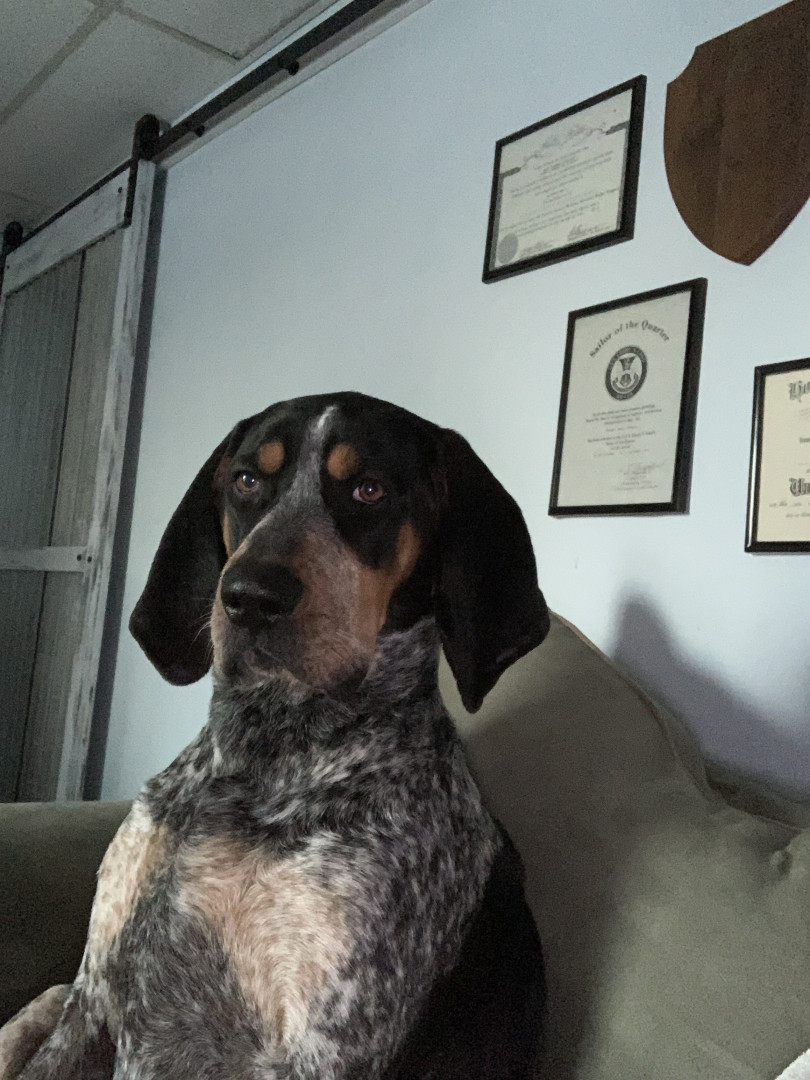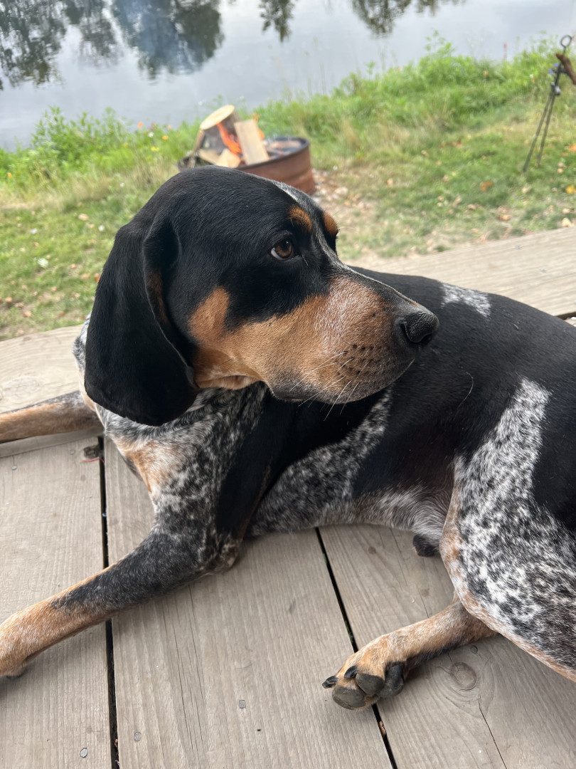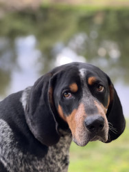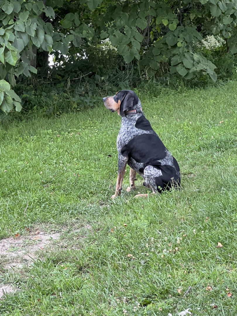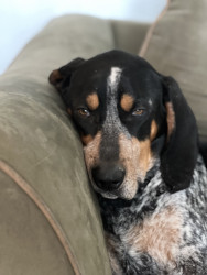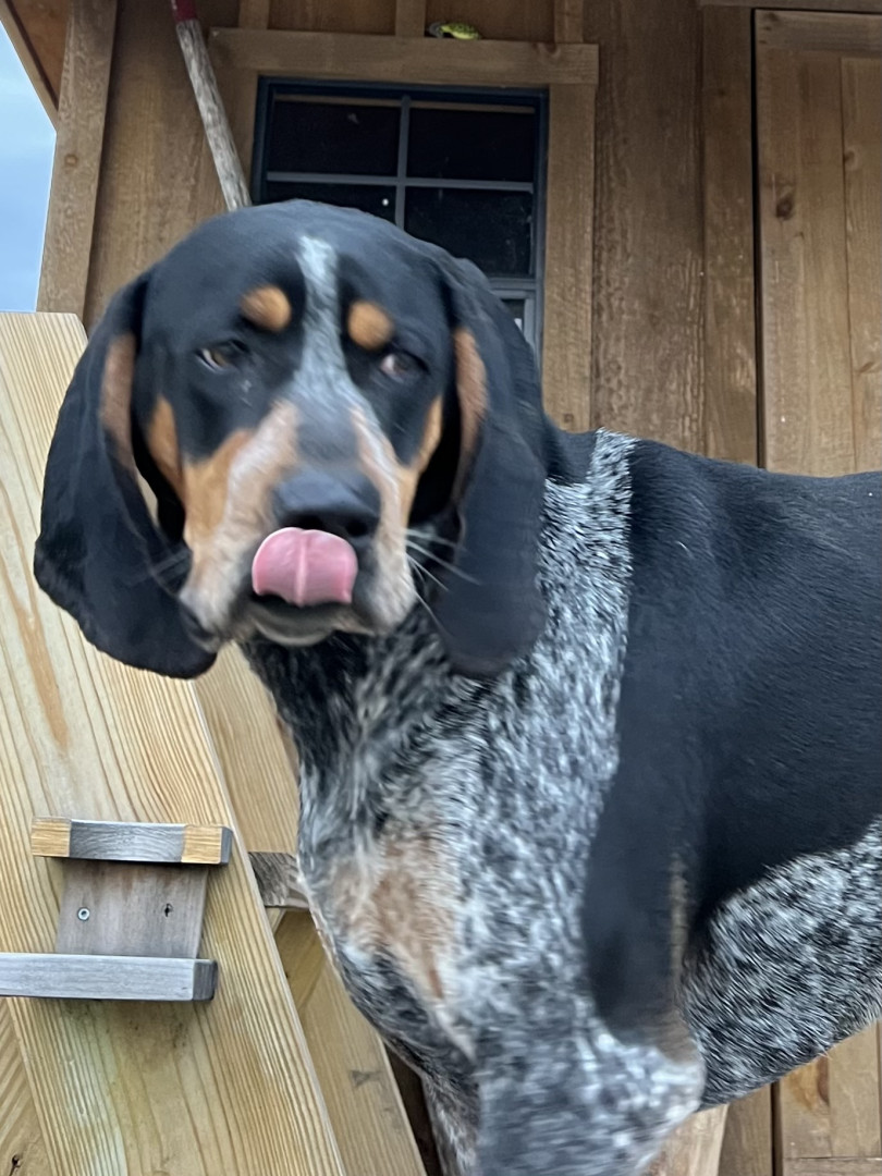 5 yr old male Bluetick Coonhound. Loves being outside and is a protector of the yard from squirrels, rabbits, and delivery drivers.