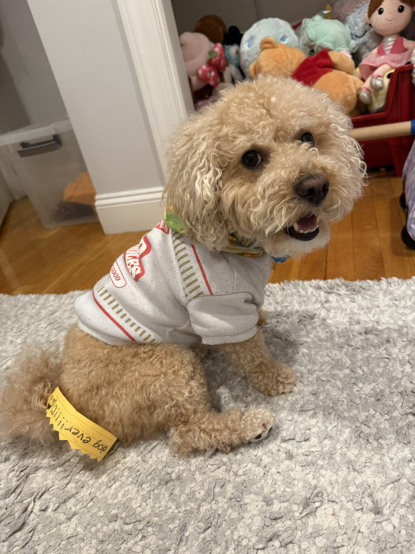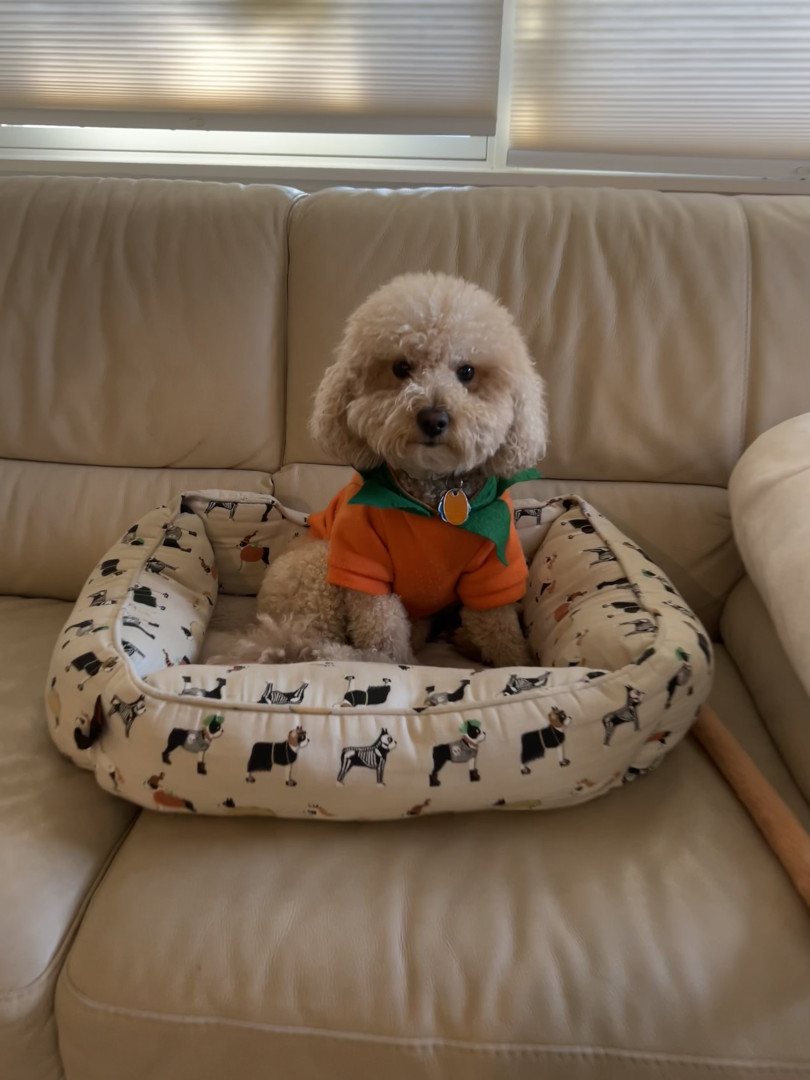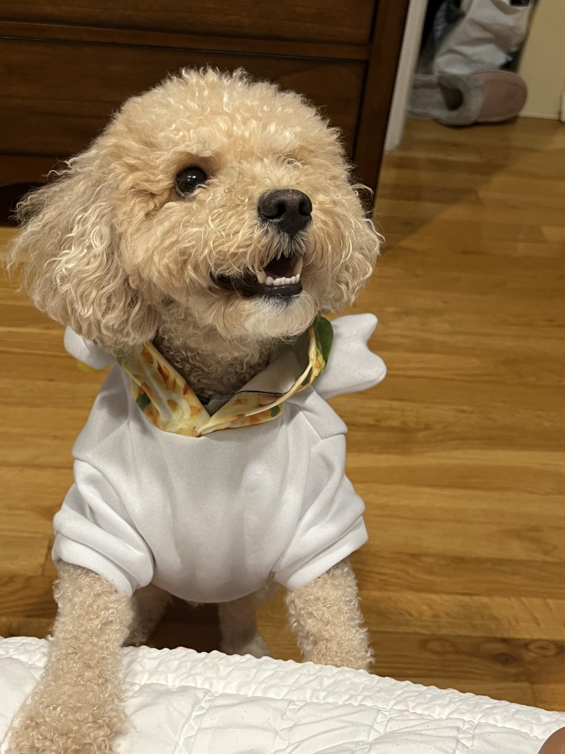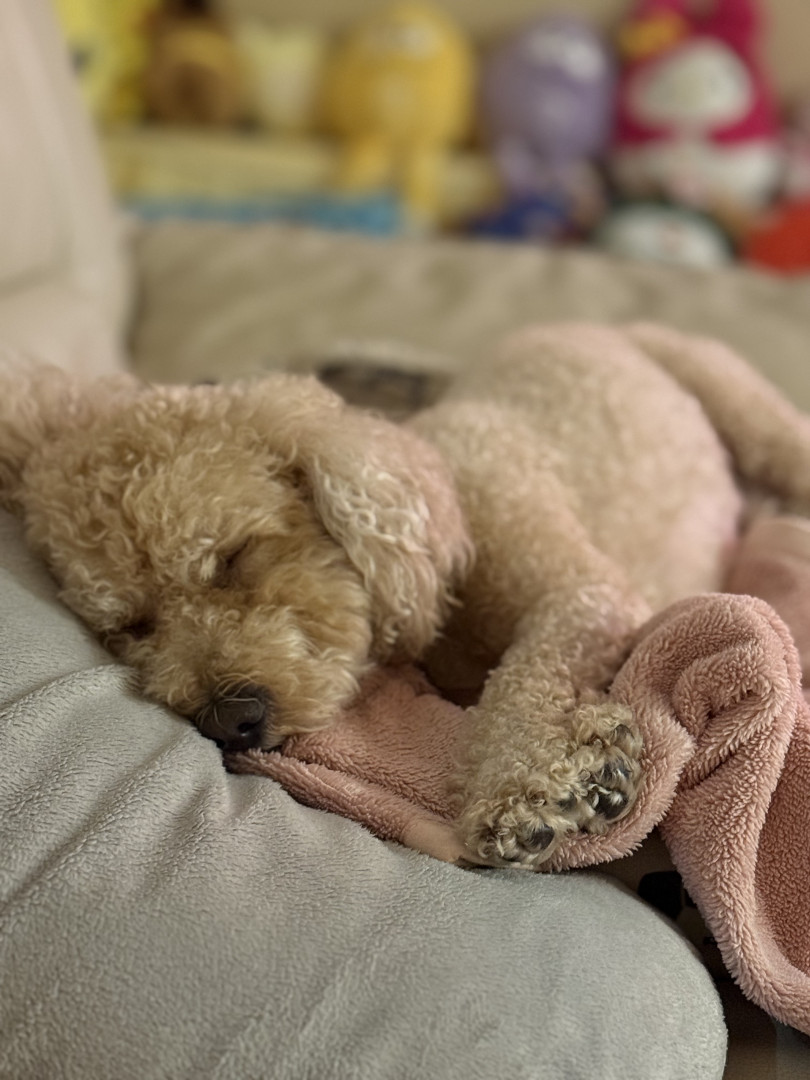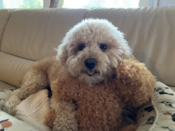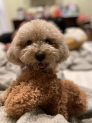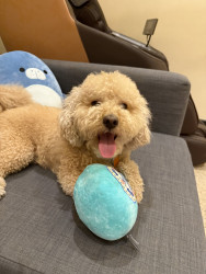 Bbang is a light chestnut colored mixed breed between a Bichon Frise and a chocolate colored poodle. He loves everything as plush as him.