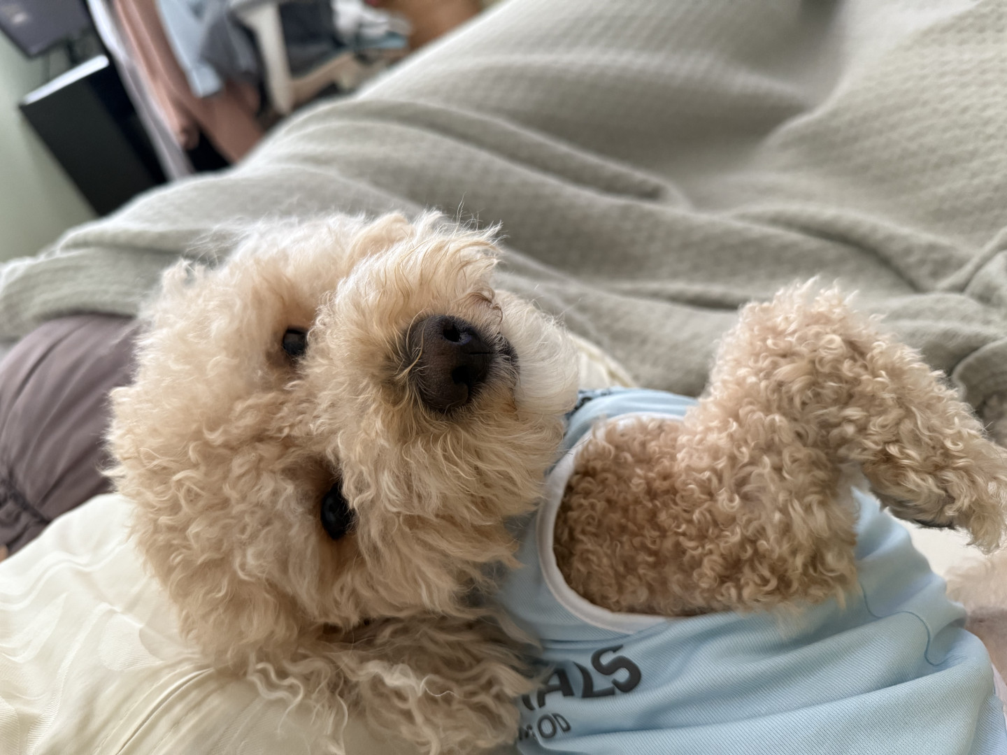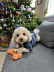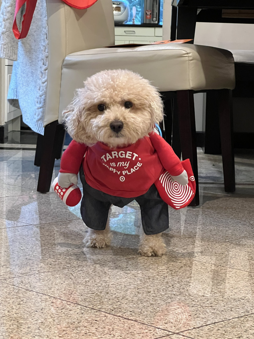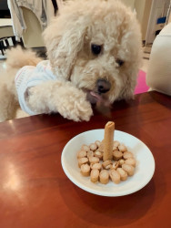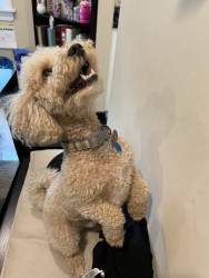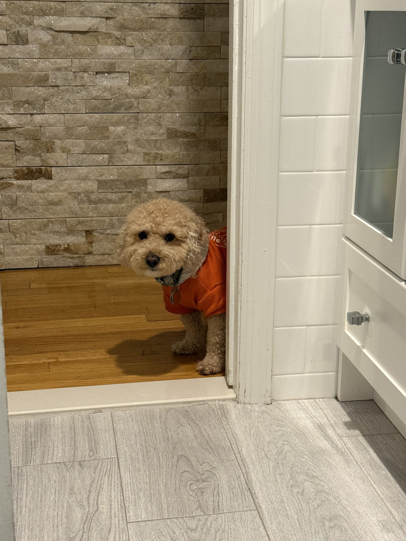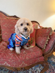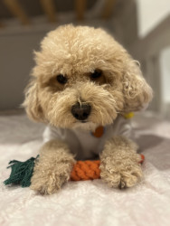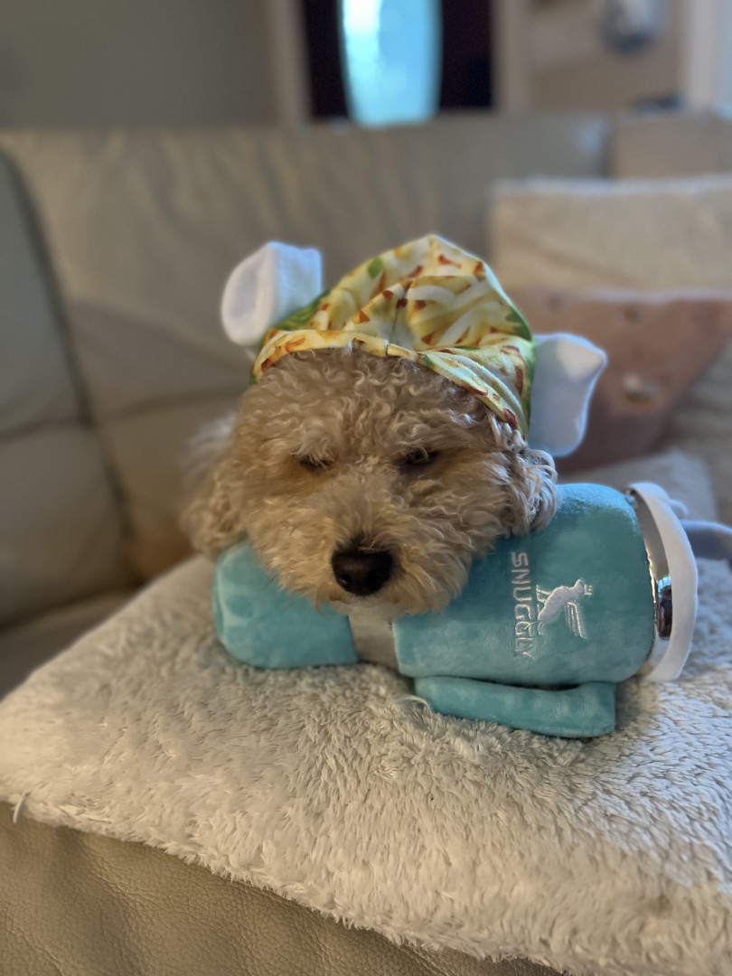 Bbang is a light chestnut colored mixed breed between a Bichon Frise and a chocolate colored poodle. He loves everything as plush as him.