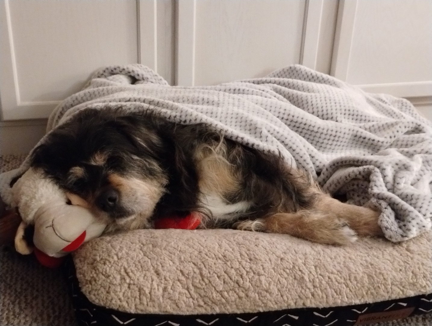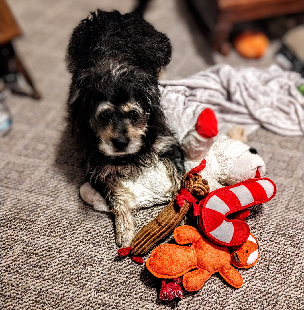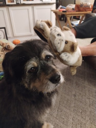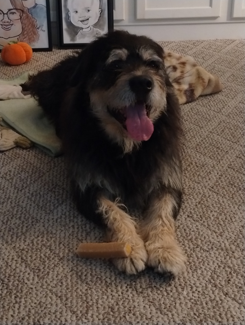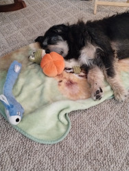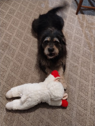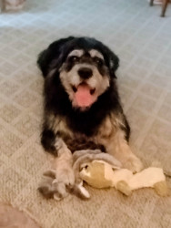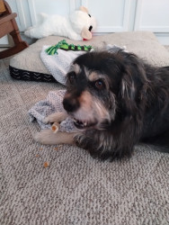 Receive Text UpdatesBear loves Jumbones, Pupperoni, and sweet potato chicken jerky treats. You can find him snuggling up in his warm bed with his oversized Lambchop stuffy or his other squeaky toys.