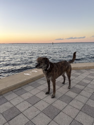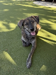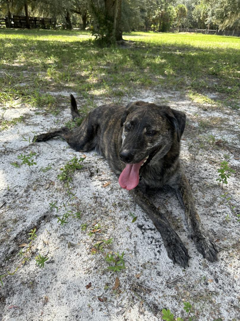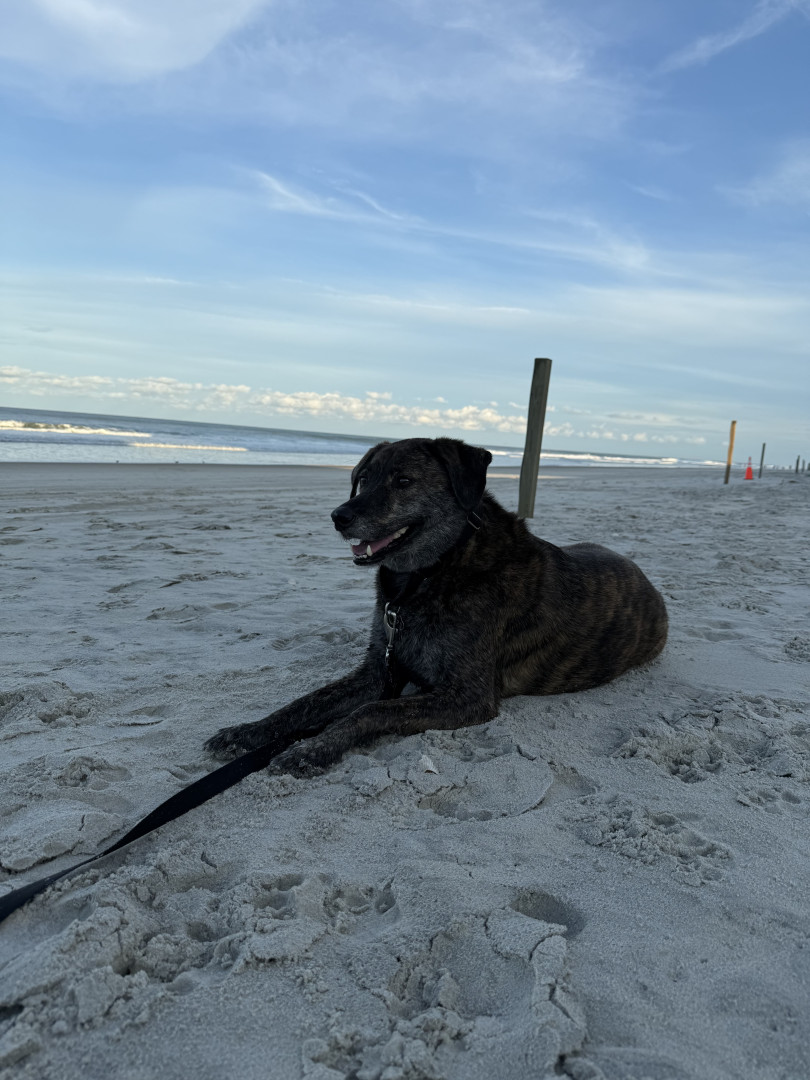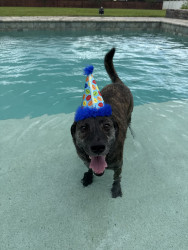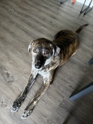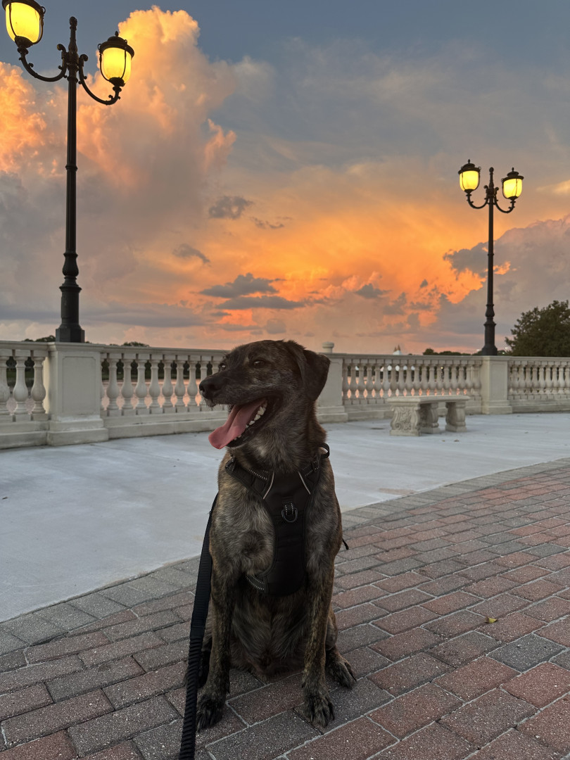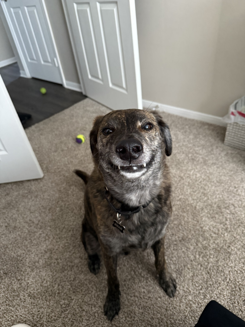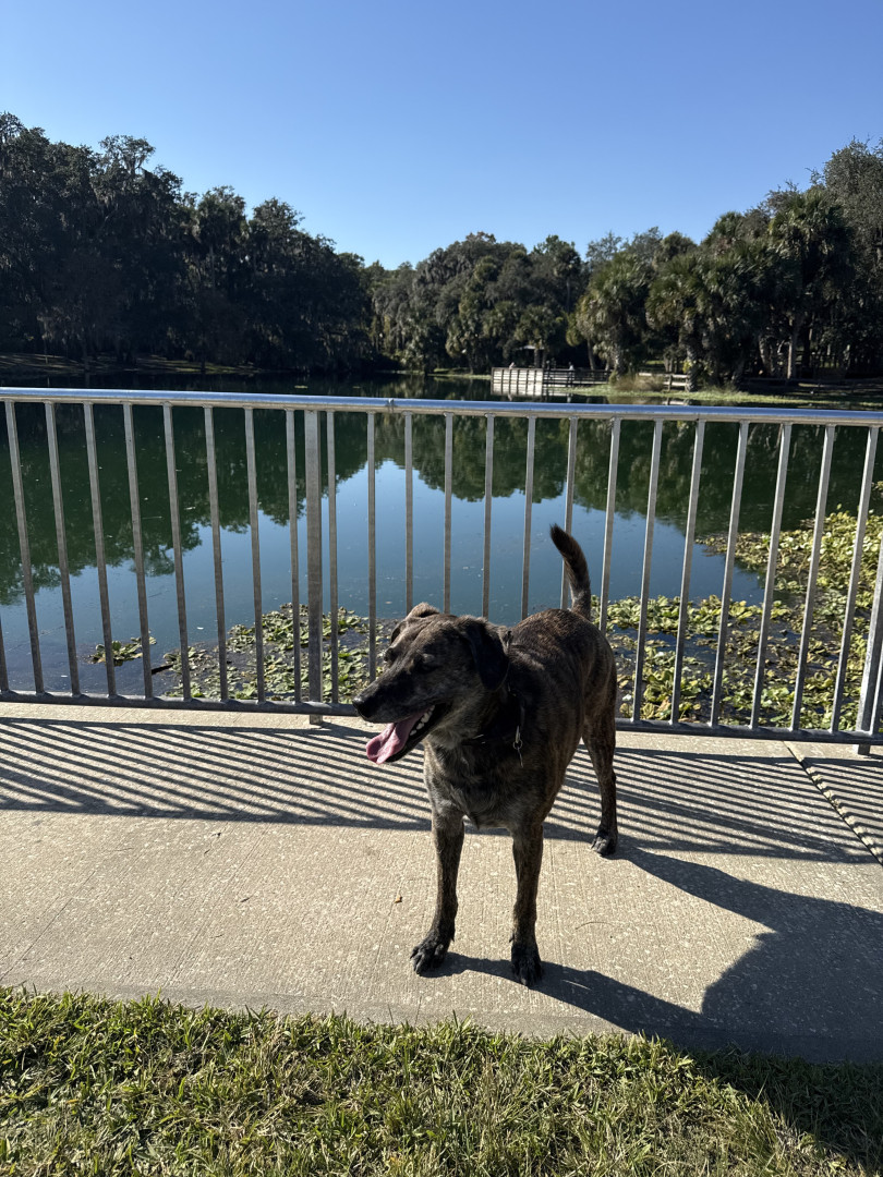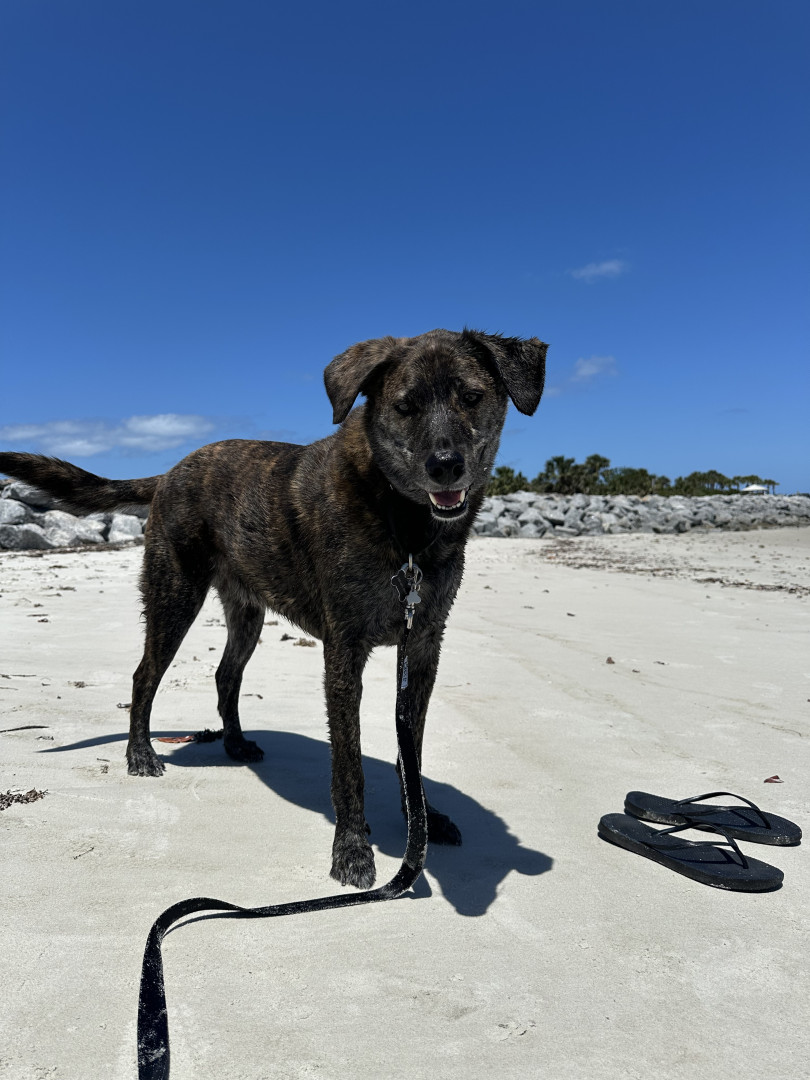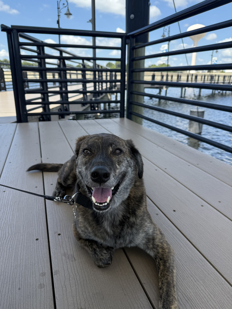 Bear is a 4-year-old brindle mix rescue from Florida who’s been by my side for 3 years. He’s calm, playful when the time is right, and has t