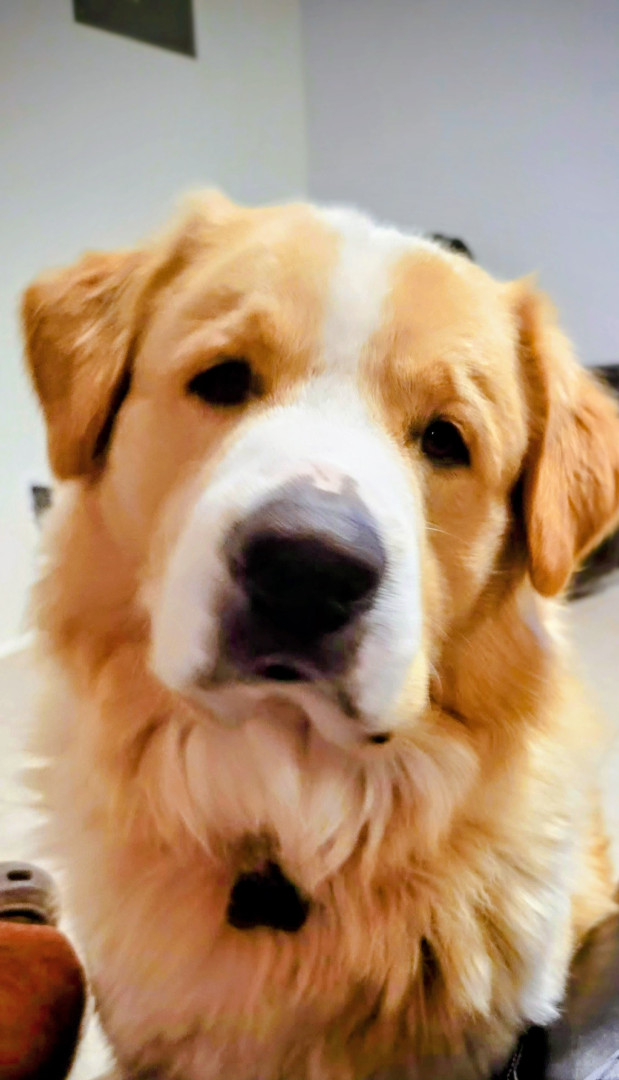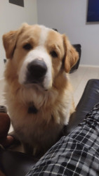 Beaux is a Golden Pyrenees. Hes a gentle giant!.Beware because he will try to get in your lap.