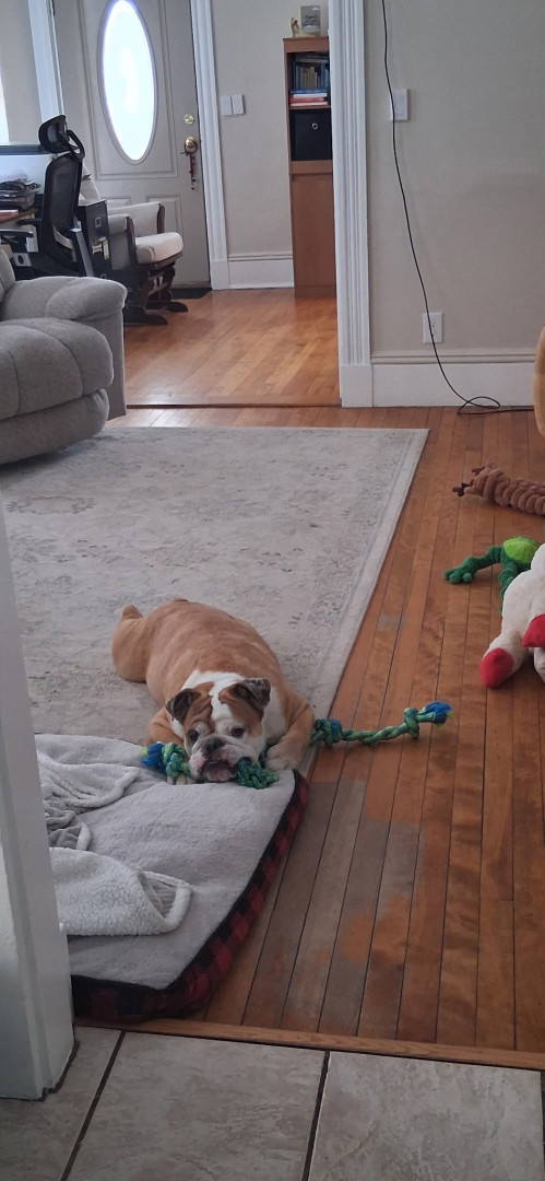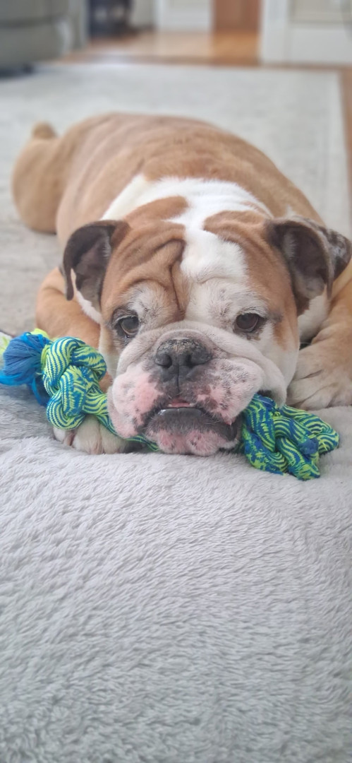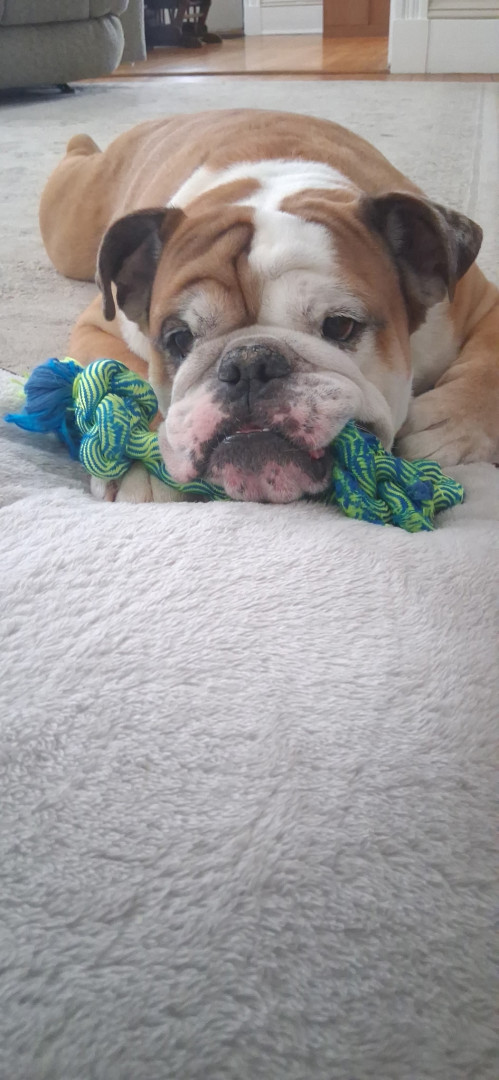 He loves his skeleton tug toy, his rubber ball, Kong ball and he loves green beans as treats