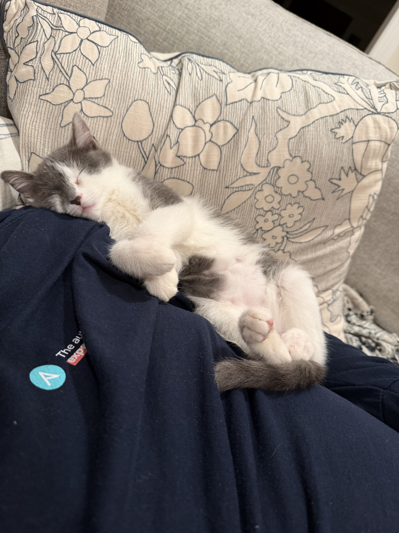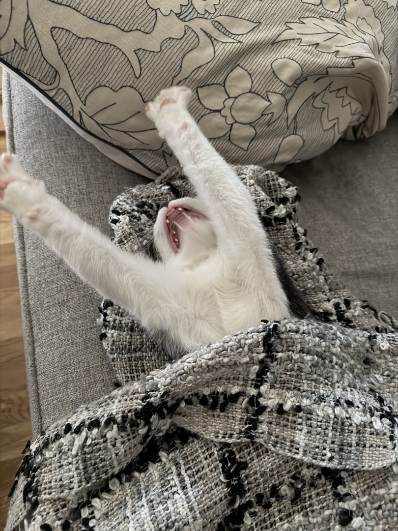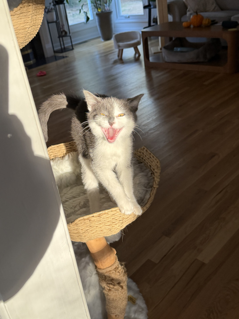He’s snuggly. He’s feisty. He’s got a ton of personality. He likes to jump out and surprise his humans and his big cranky sister Pip. He thinks the world is his jungle gym.