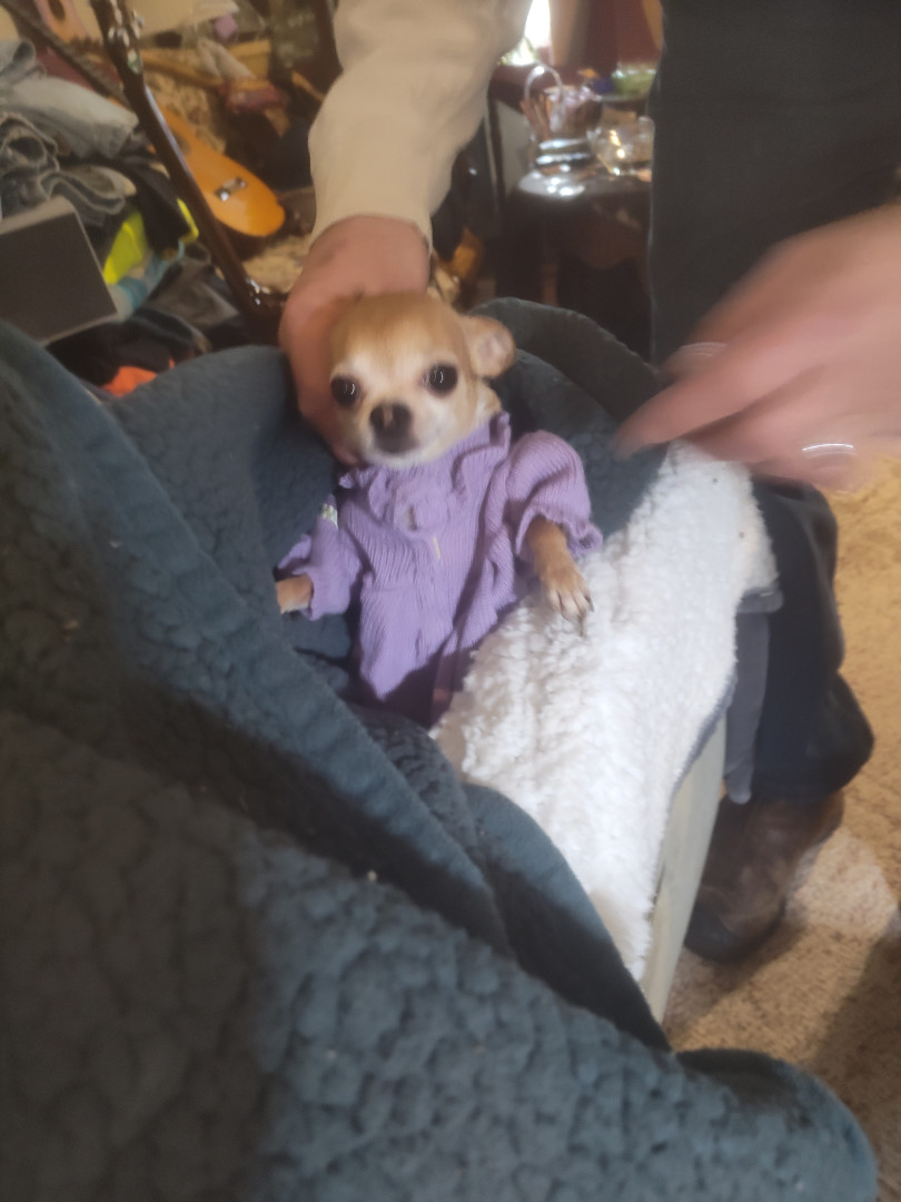 Bella is a Chihuahua she just 4 pounds that's as big as she gets sweet heart loves to play with her toys