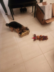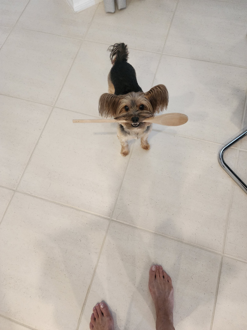 she always tries to problem solve... so she doesn't get in trouble for barking she has figured out to grab a toy for a muffled bark.. I scared her once for fun and now she waits around the corner very quietly so she can scare mama