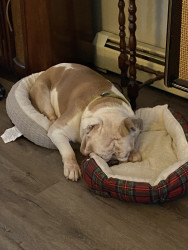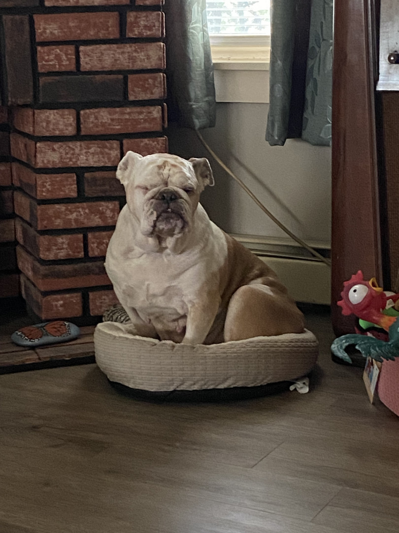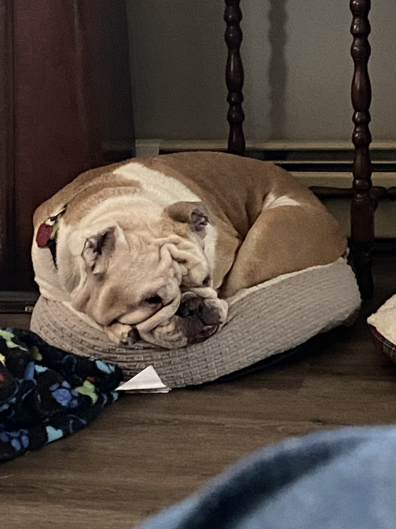No matter the dog bed, no matter who’s dog bed she will try and sleep in it including the small ones. It’s just so funny to see her trying to fit her pork chops in there.