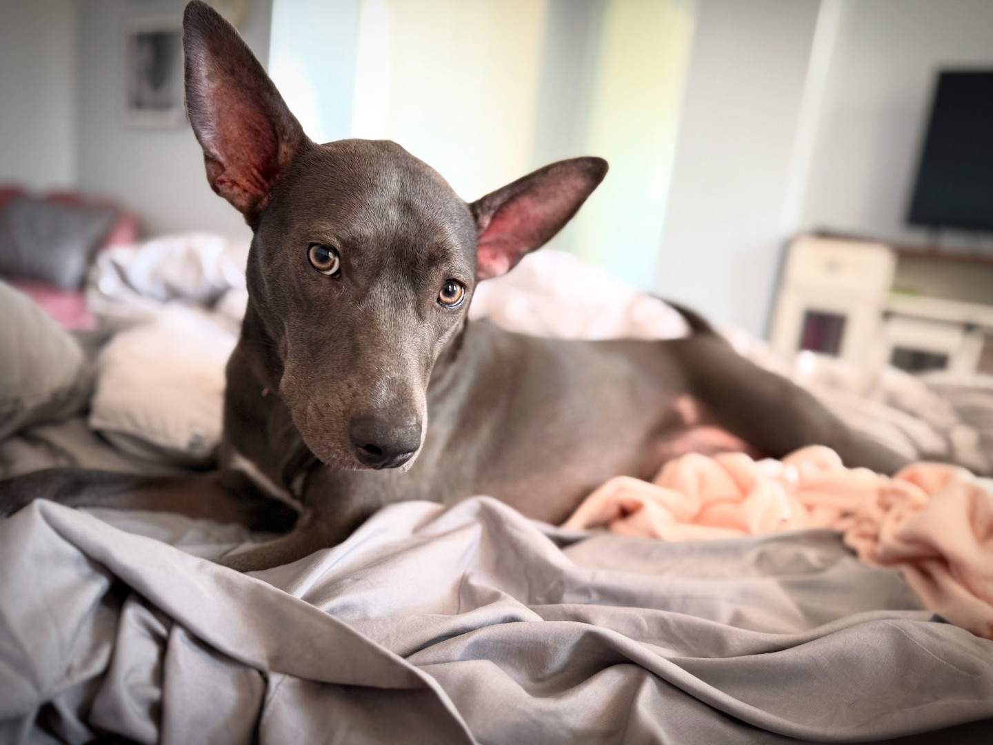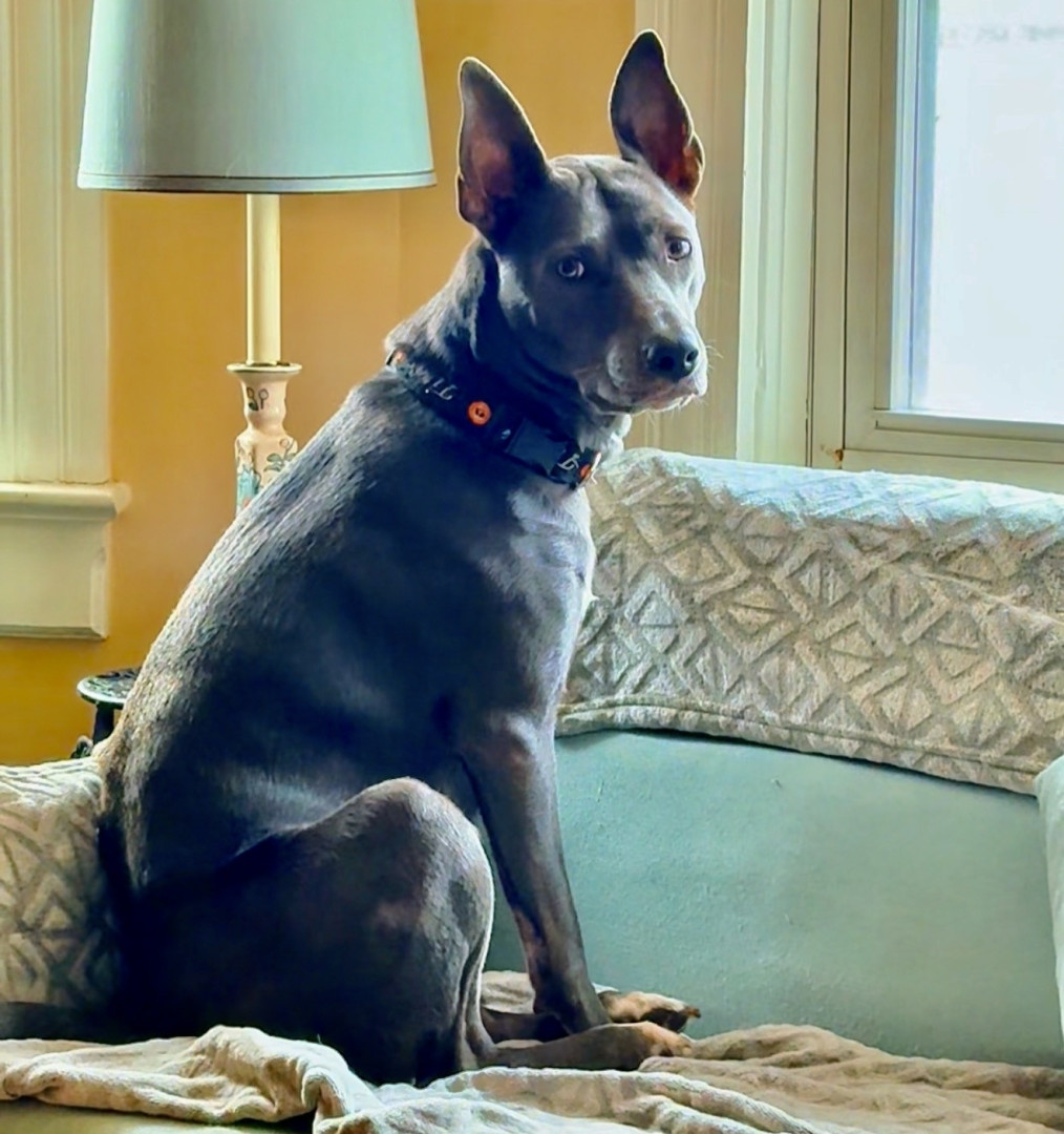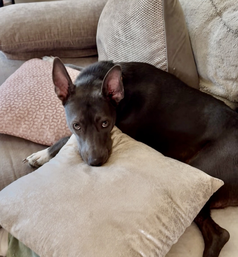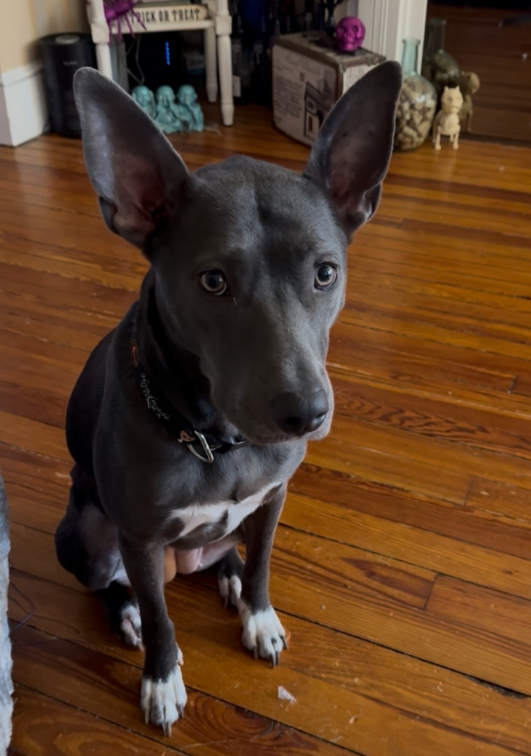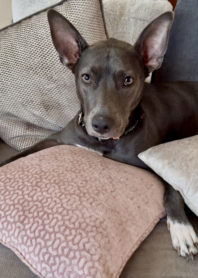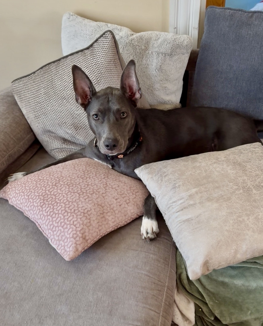 Bella has a unique look that you don’t see every day. Being part pitbull and part doberman, she definitely got the best of both breeds. She has very distinct ears and a beautiful silvery coat. Four white paws and a white tail tip complete her look!