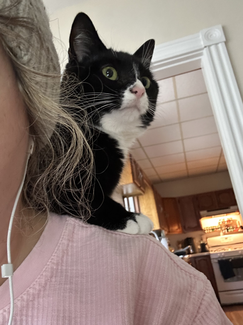 Belle loves people. She needs to be with us most of the day. She likes lounging on your shoulders. She snorts when she cleans her toes.