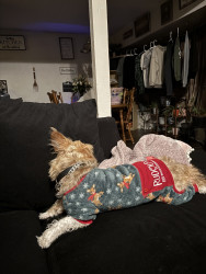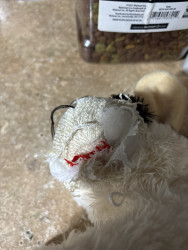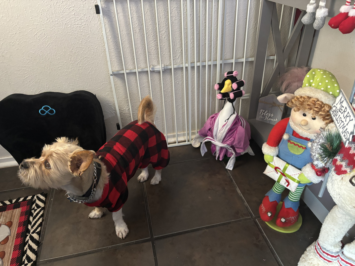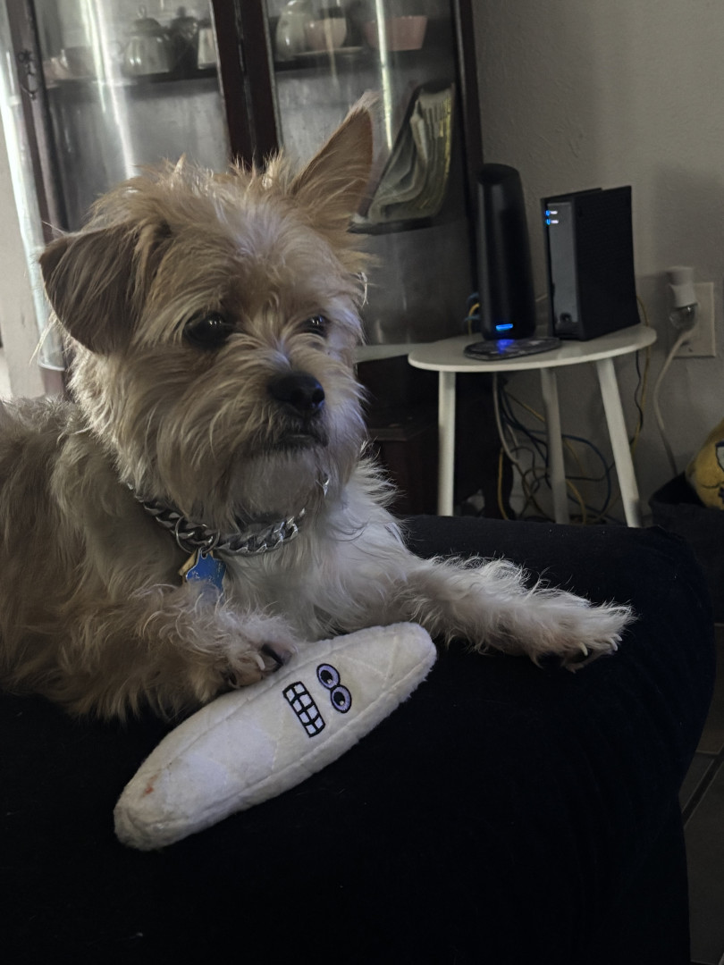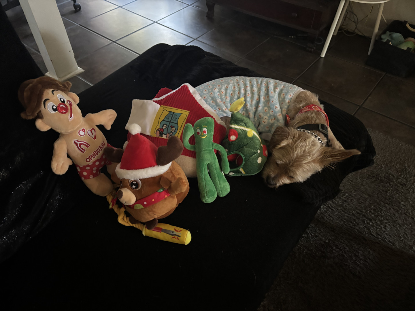Go to treat is always a slice of cheese or a cheese stick or shredded cheese basically anything cheese. Benji has many favorite toys. His toy box may be overflowing! He really likes lamb chop but he also likes gnomes. He also likes Santa Claus and then there’s just broccoli and then he’s got Dr. Seuss. OK yeah I don’t think Benji has a favorite.