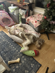 Mr. Pig is Benny’s favorite toy (latex polkadot pig) and he got a jumbo version for christmas. His favorite treats are freeze-dried chicken hearts or chicken breast cooked in beef broth.